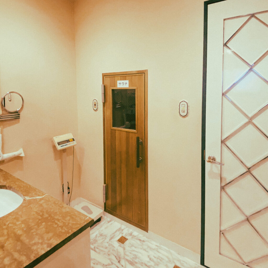 ここを開くと、お風呂場とサウナ。サウナは全室完備のよう。