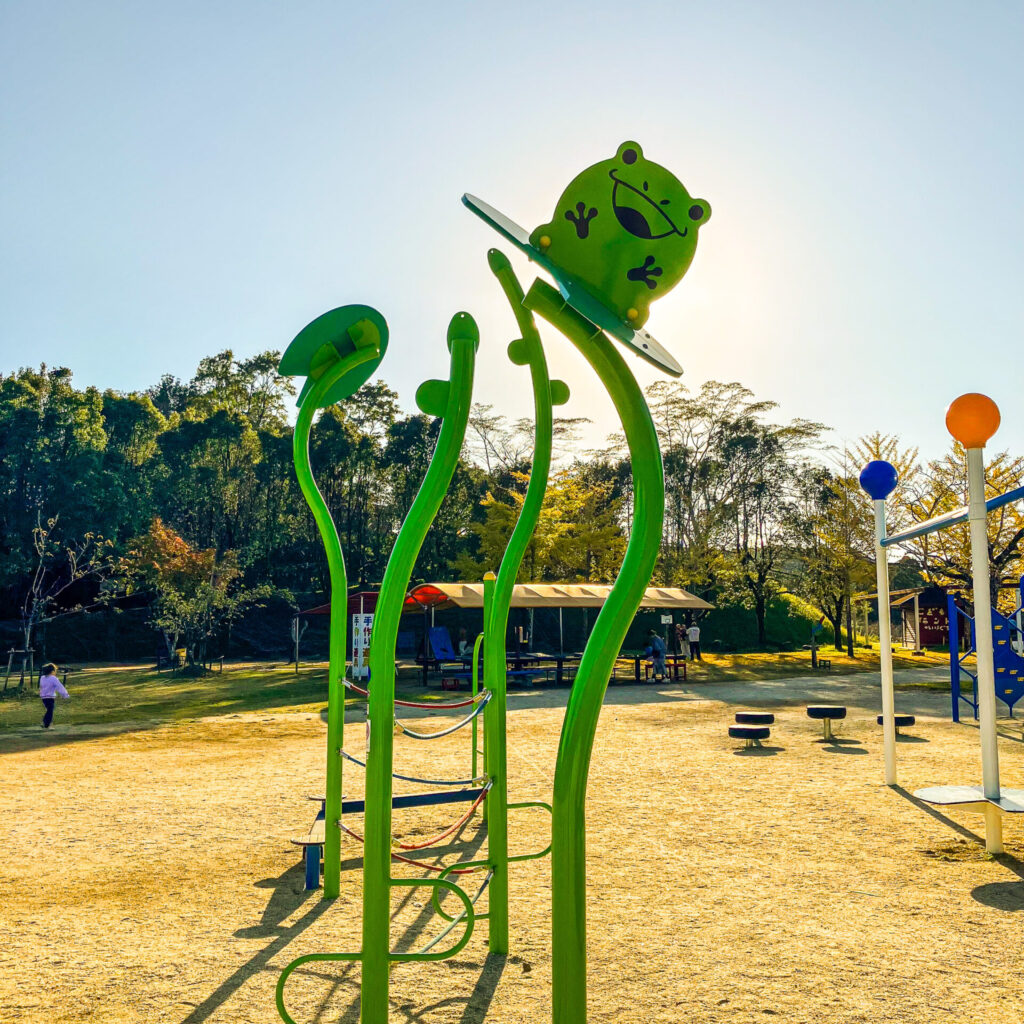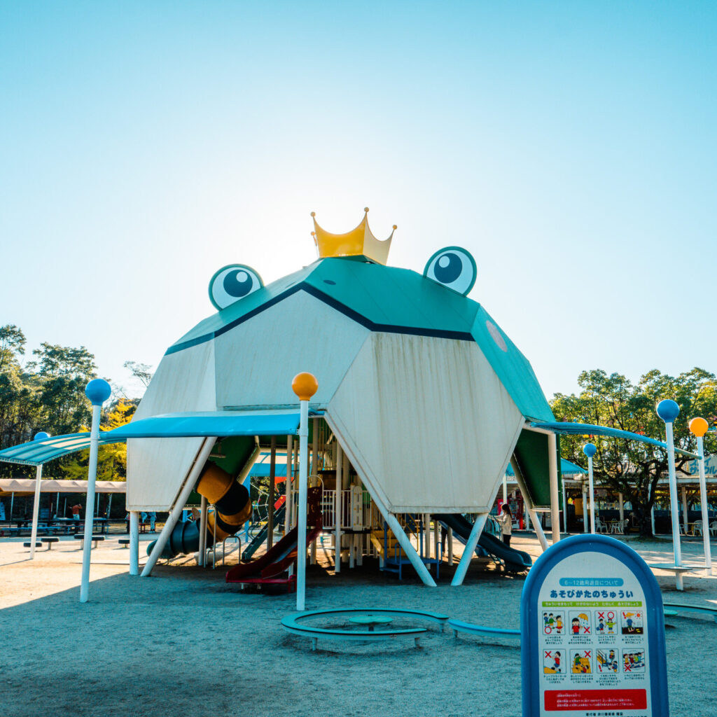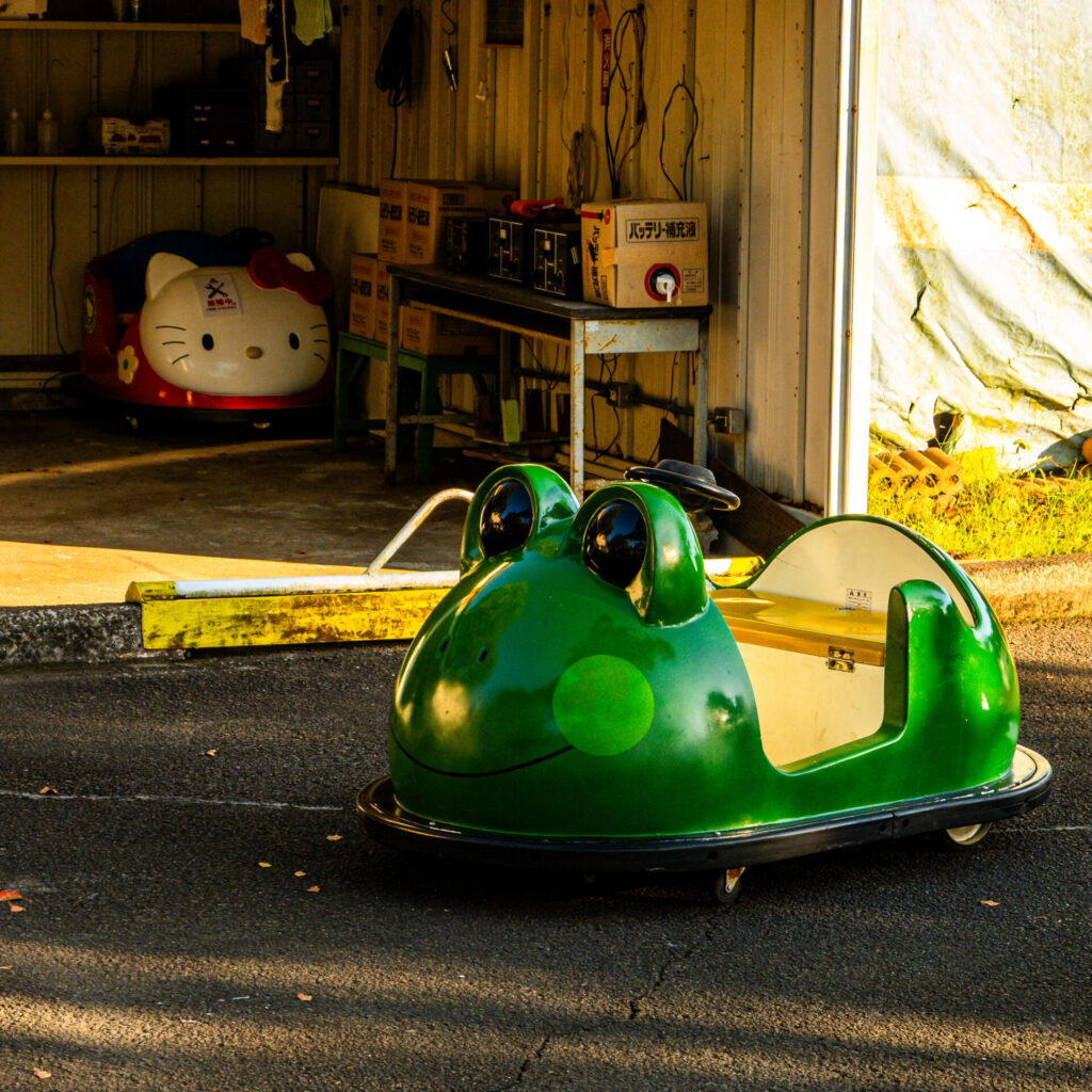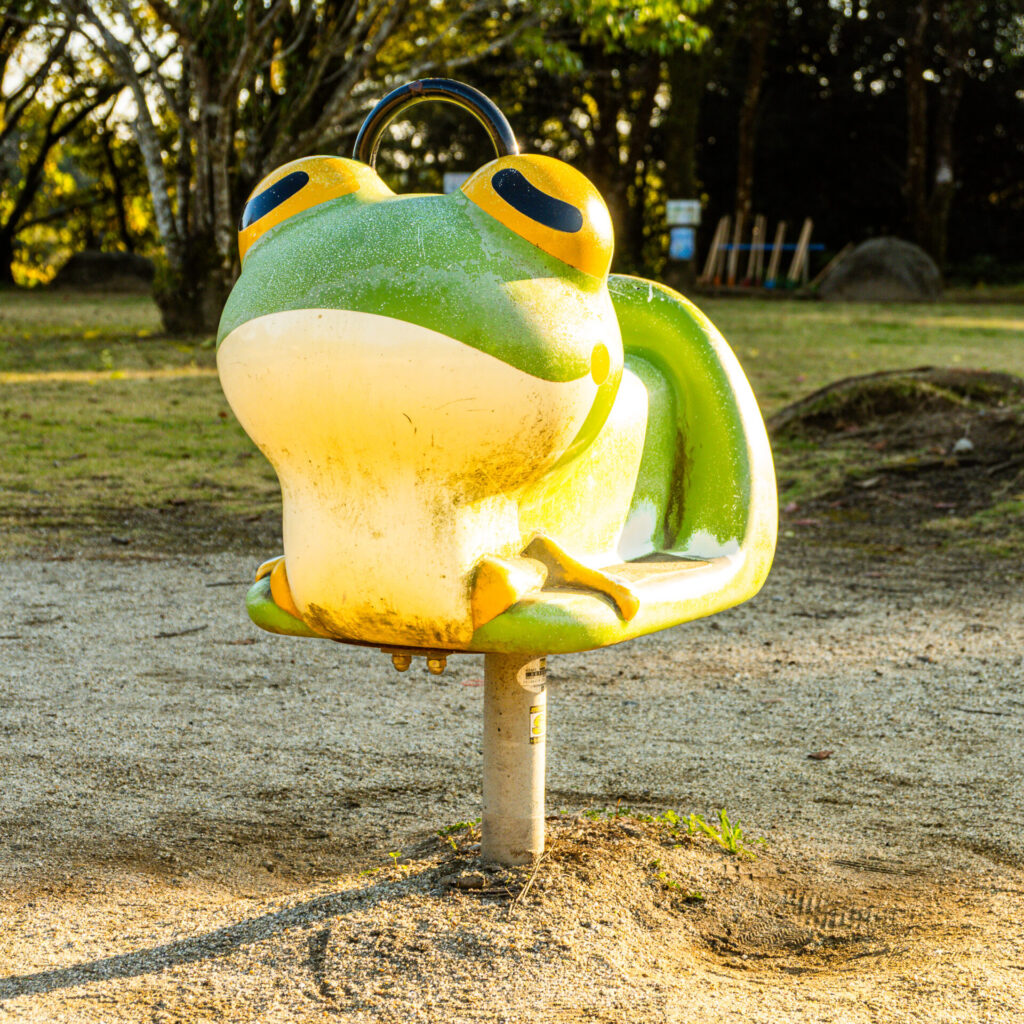 のじりこぴあは子ども向けのレジャーランド。遊具エリアやバッテリーカーのコーナーにも、ちょこちょこカエルを発見。