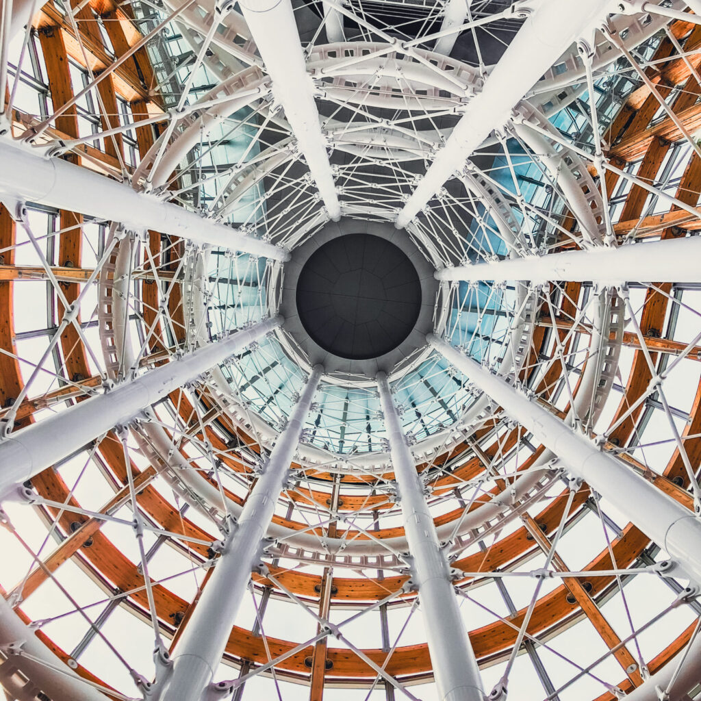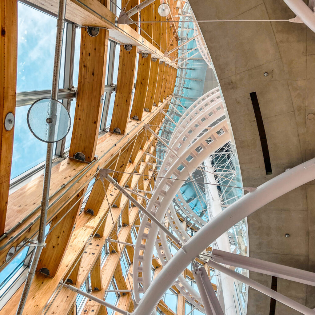 見上げると、白いリングとワイヤーが複雑に組まれており、安定したタワーを作り上げている。