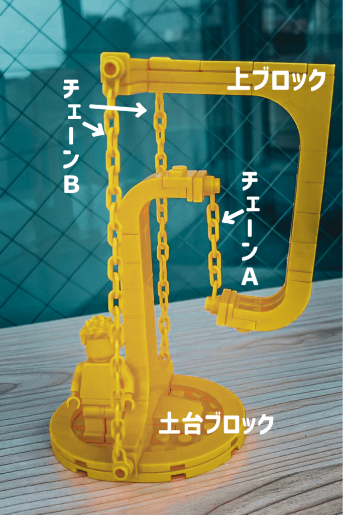 ②上ブロックは重力がかかるので、土台ブロックからチェーンAで吊るし、支える。