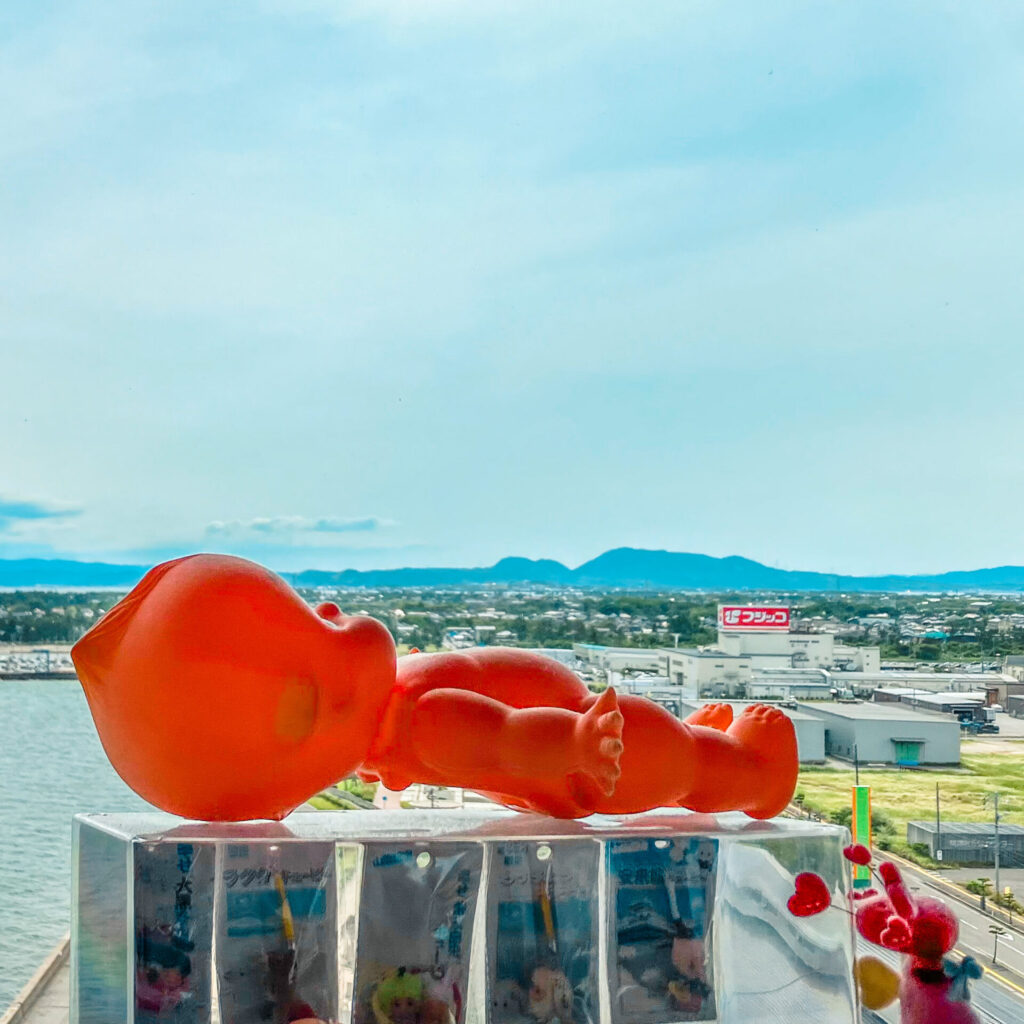 日本海を望める360度パノラマの眺め。内陸側には、キューピー山といわれる山があるらしい。ご丁寧にキューピー人形と比較できるようになっている。ね、なんとなくわかるでしょ?お腹がぽっこりしてるキューピーの寝姿。記念にスタンプもどーぞ。