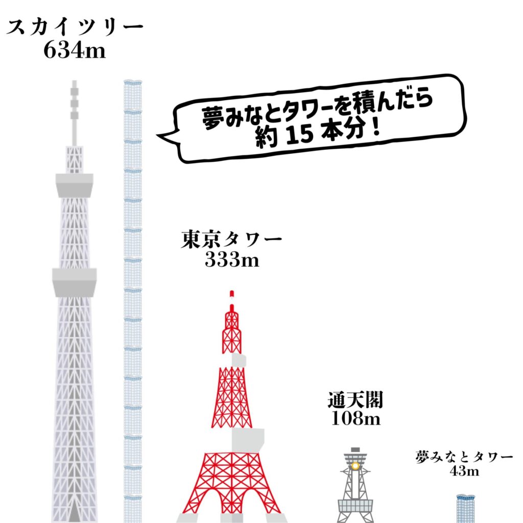 ちっさ!日本一の高さを誇る東京スカイツリーと比べると、大きさは段違い。夢みなとタワーが約15本積める高さ。なんて可愛らしいタワーなのだ。