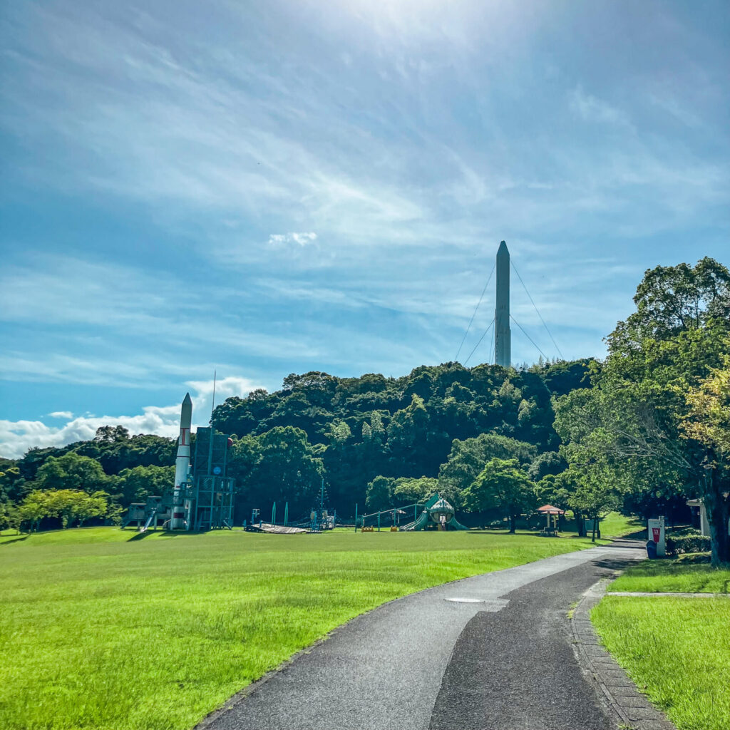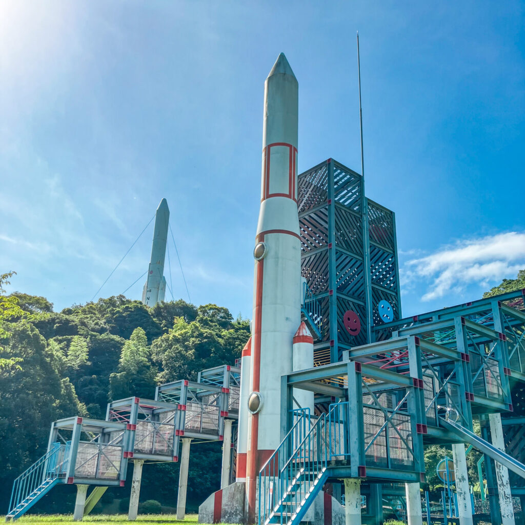 歩いて行くと見えてきたのは、2本のロケット。大きい方のロケットはH-Ⅱロケットの模型。種子島宇宙センターから打ち上げられていた液体燃料式ロケット。