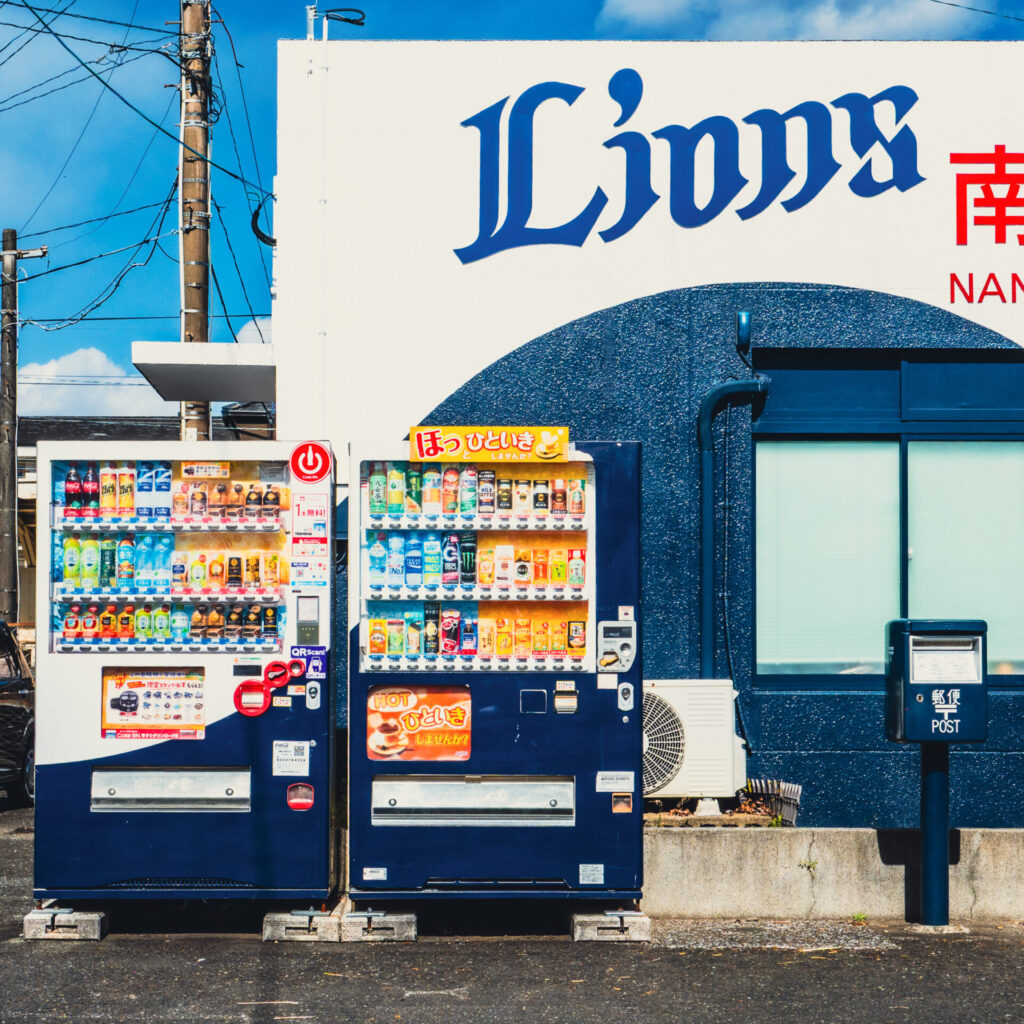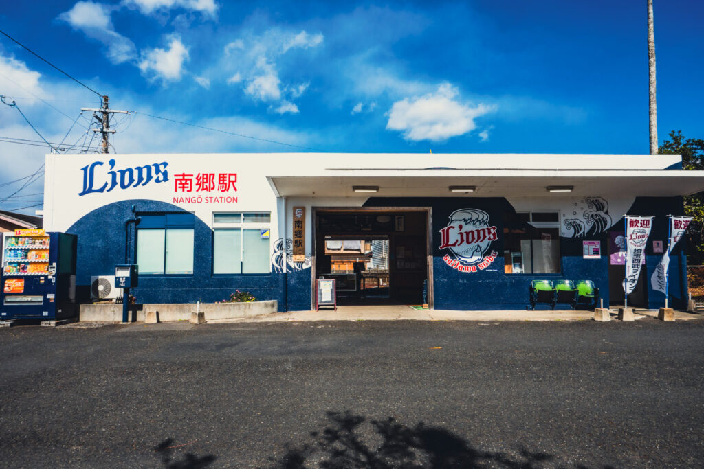 日南市の南郷駅は、西武ライオンズ仕様。自販機やポストまでライオンズカラーという徹底ぶり。