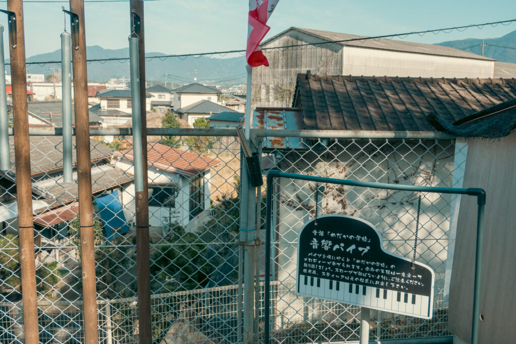 こちらには、1本ずつ順番に打っていくと、童謡「めだかの学校」が演奏できる音響パイプ。