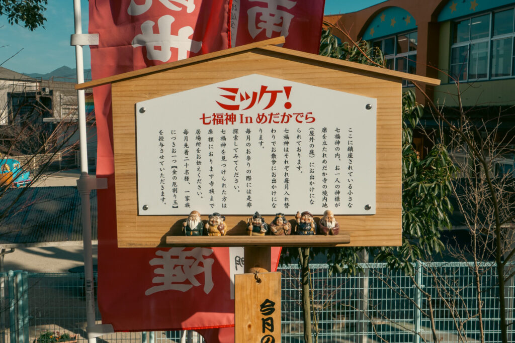 この記事内で、めだか寺にある七福神ミッケを紹介しました。お出掛けして居なくなっている七福神が、記事内の写真のどれかに写っています。さてどこにいるでしょう???