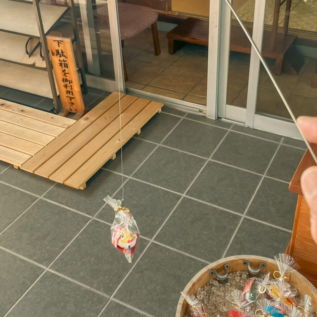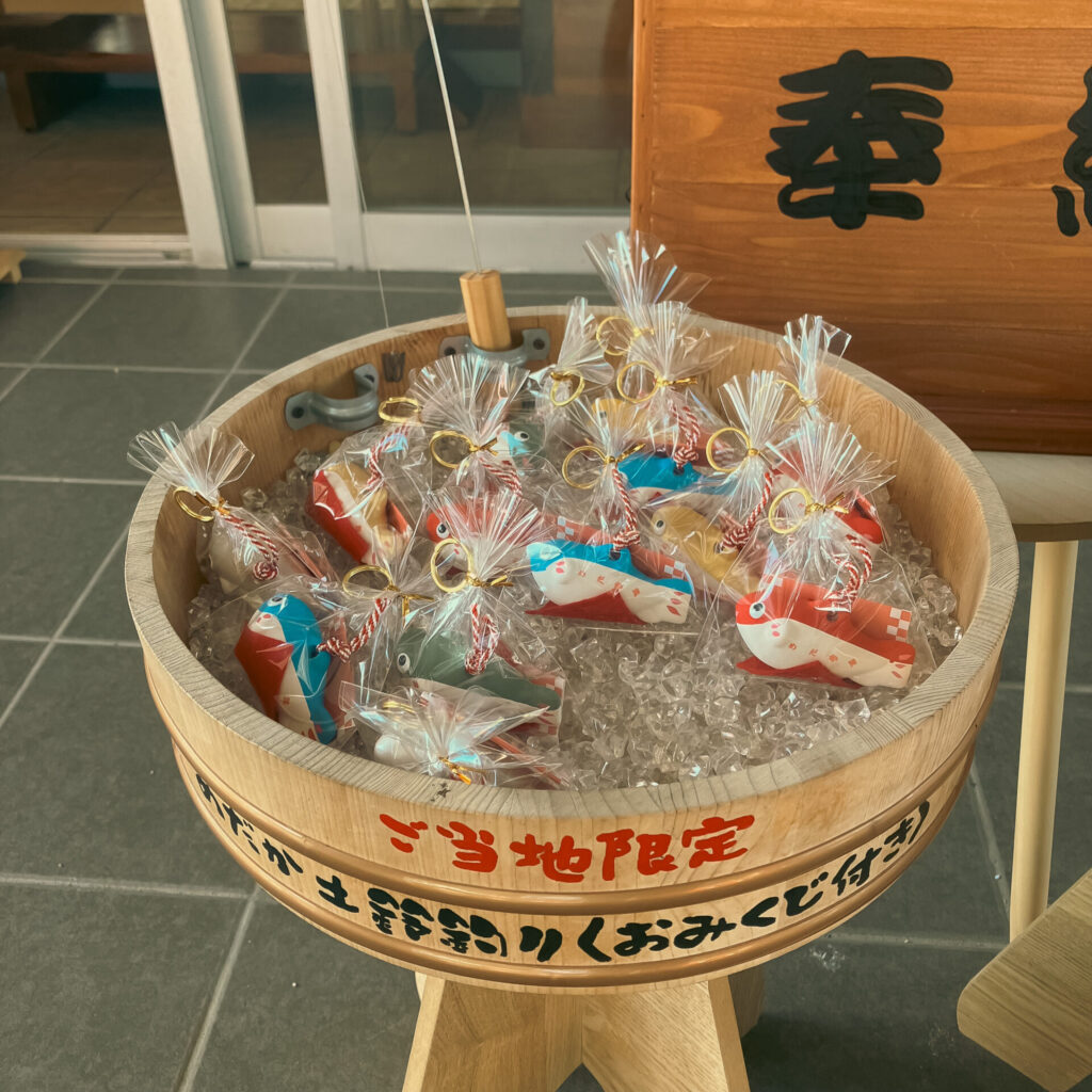 おみくじ付きメダカ土鈴。もちろんやりましたよ、土鈴集めてますから。
