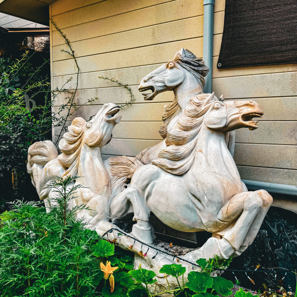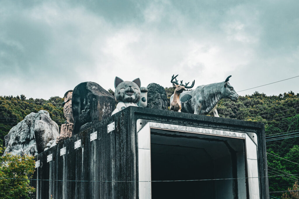 先ほど入り口で見た牛の奥にはたくさんの動物達がいた。これはもしかして、ノアの方舟の表現だろうか?鹿にフクロウ、観音様っぽいのもいる。ネコに関しては招き猫。