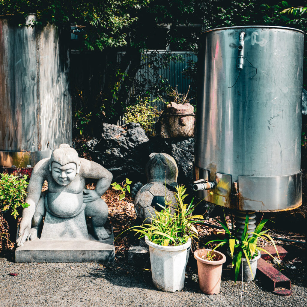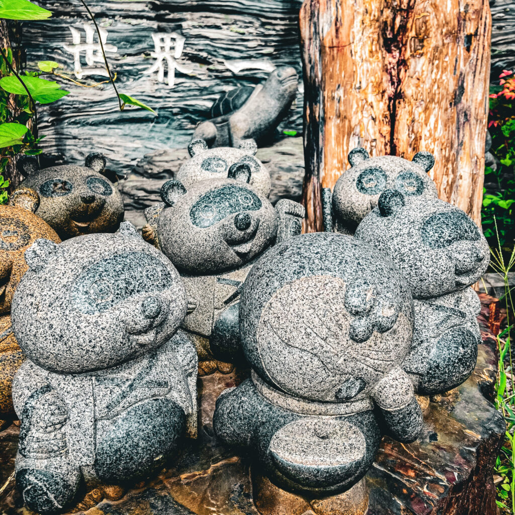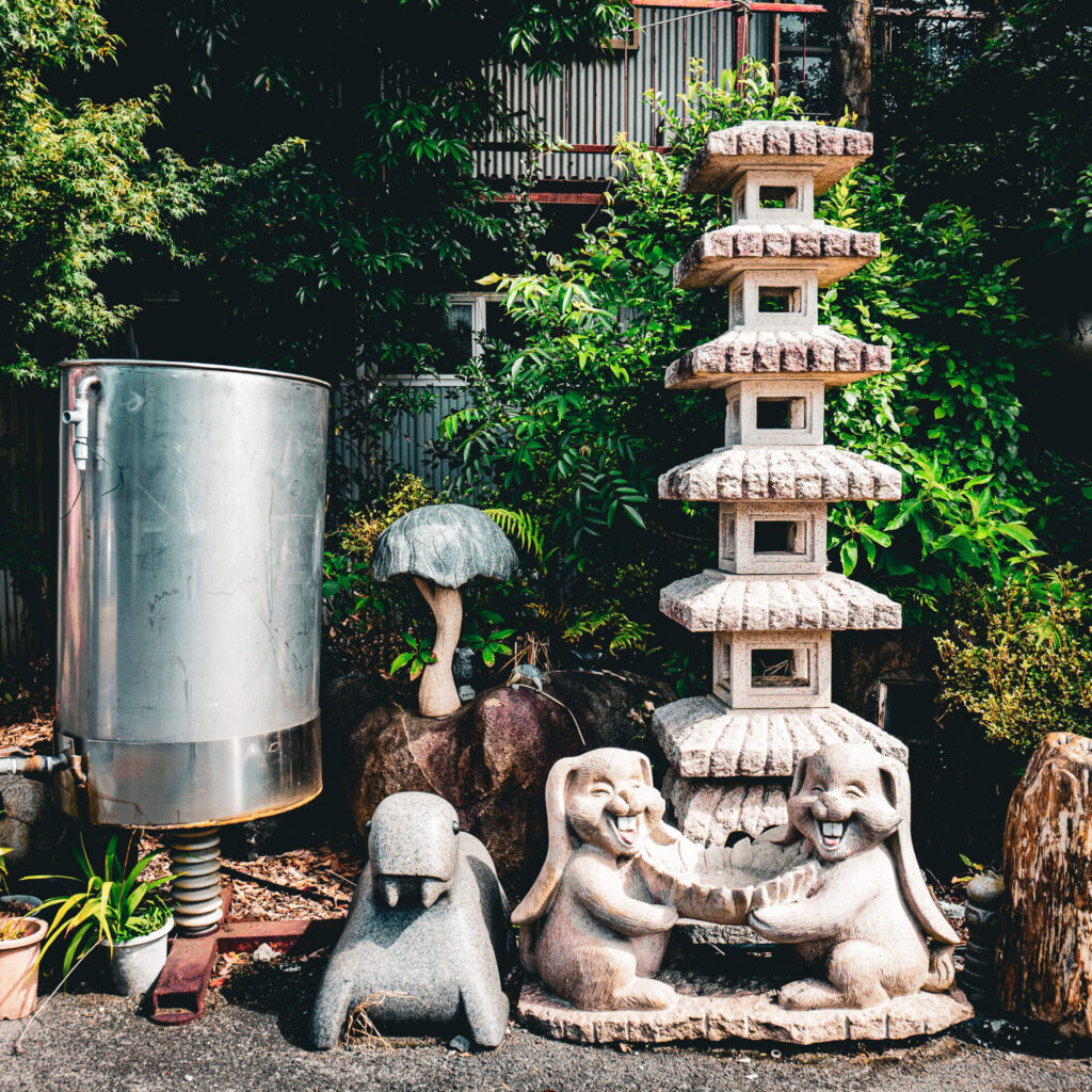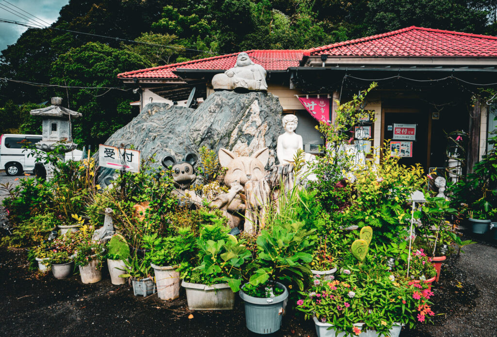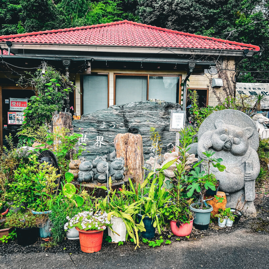 受付と、「ようこそ世界一温泉へ」の石板の存在を打ち消すオブジェ達。たぬき達に紛れるドラえもん、一番好きかも。