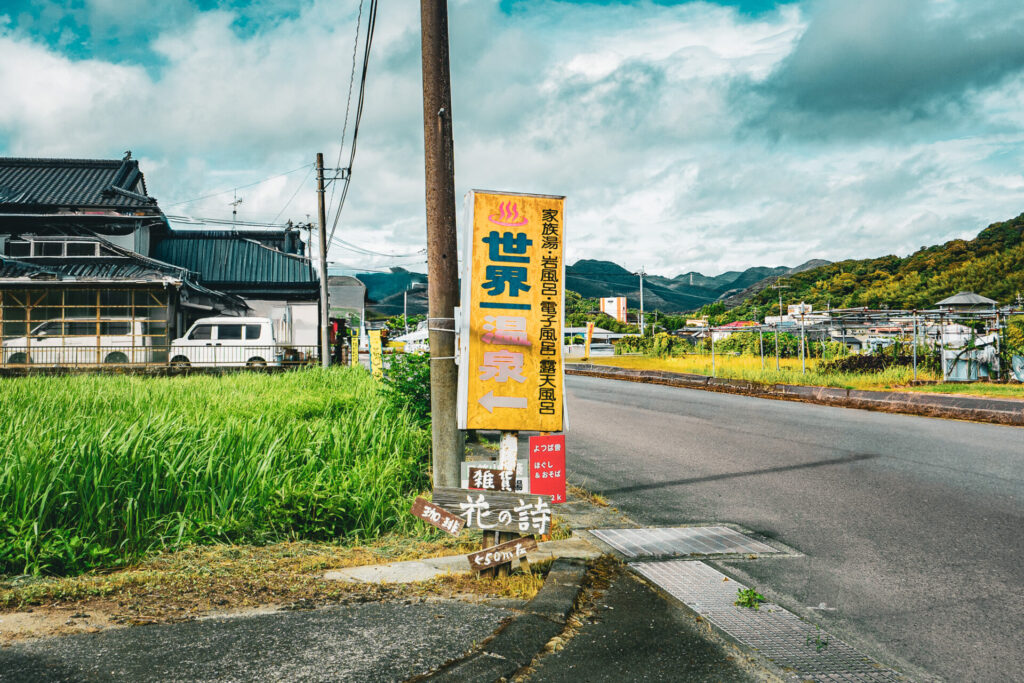 世界一温泉…半信半疑だが、言われるがまま進む。道路脇には、たどり着くまでのぼりも立っているので、おそらく迷う事はない。