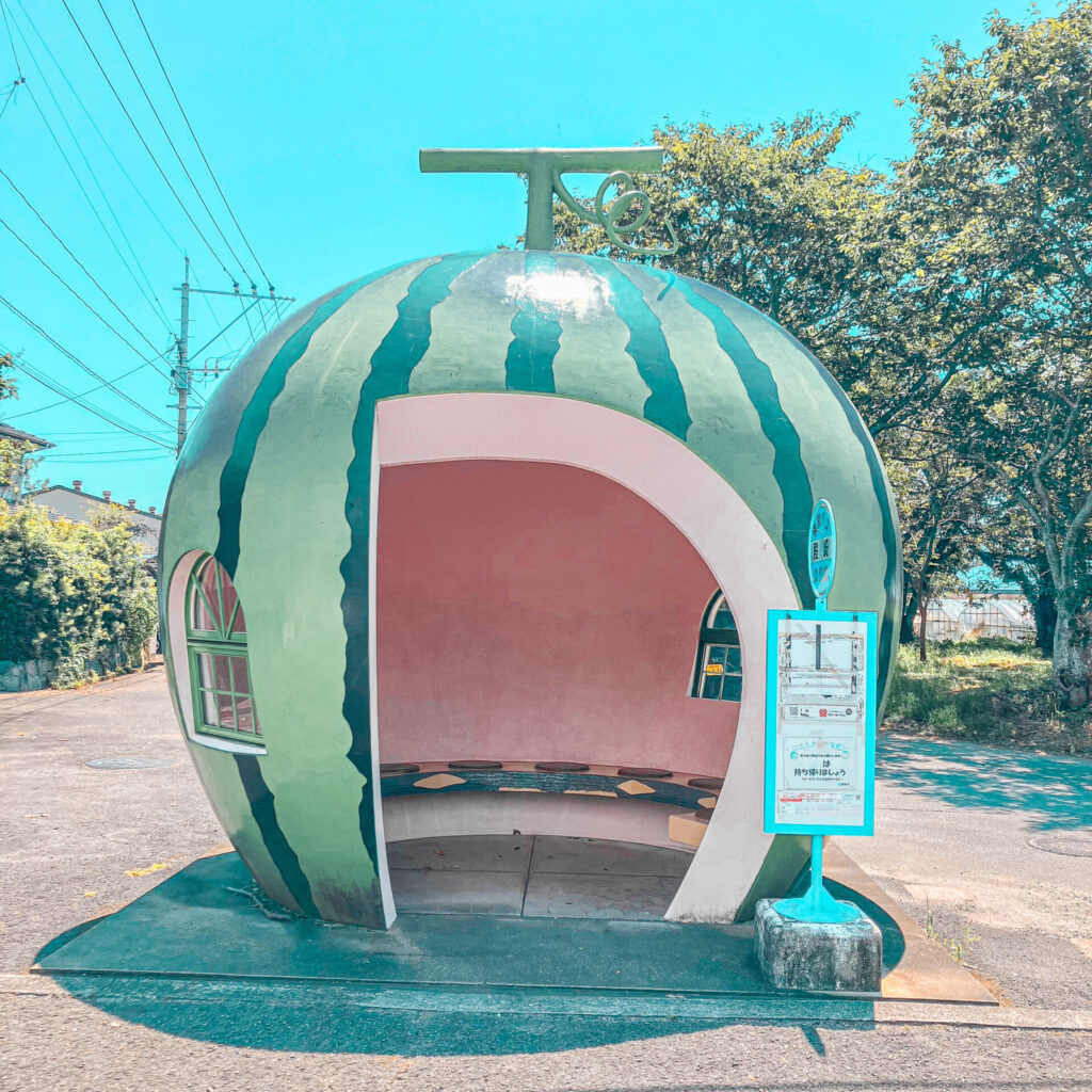 平原のバス停にはメロンといちごのバス停が。青空と海がよく似合う。