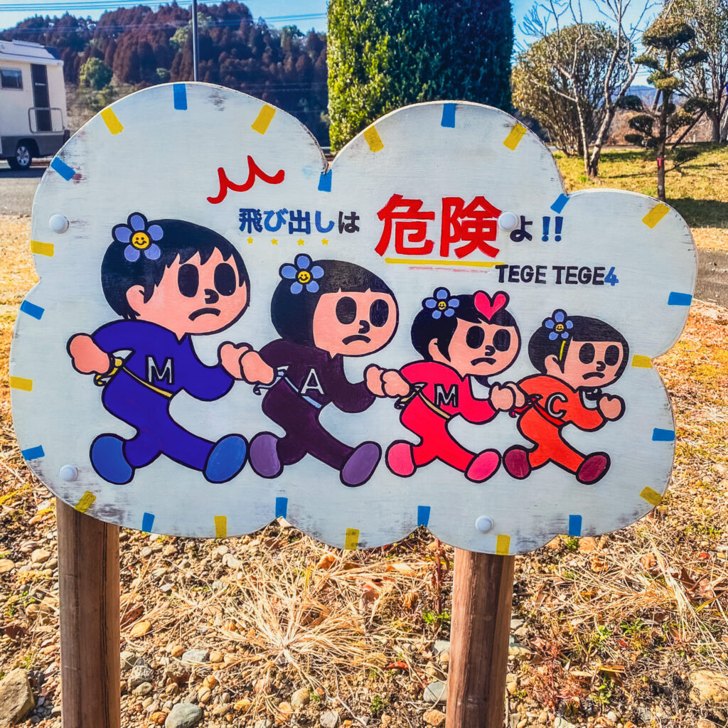 木城温泉館湯ららの敷地内に設置されているオートバイ神社。ここにはおしゃれなヘルメットを被った飛び出し坊や、そして4人並んだガールズが。TEGE TEGE4とはスーパーカブの女子4人組グループのようだ。胸には名前のイニシャルが入ってるようです。