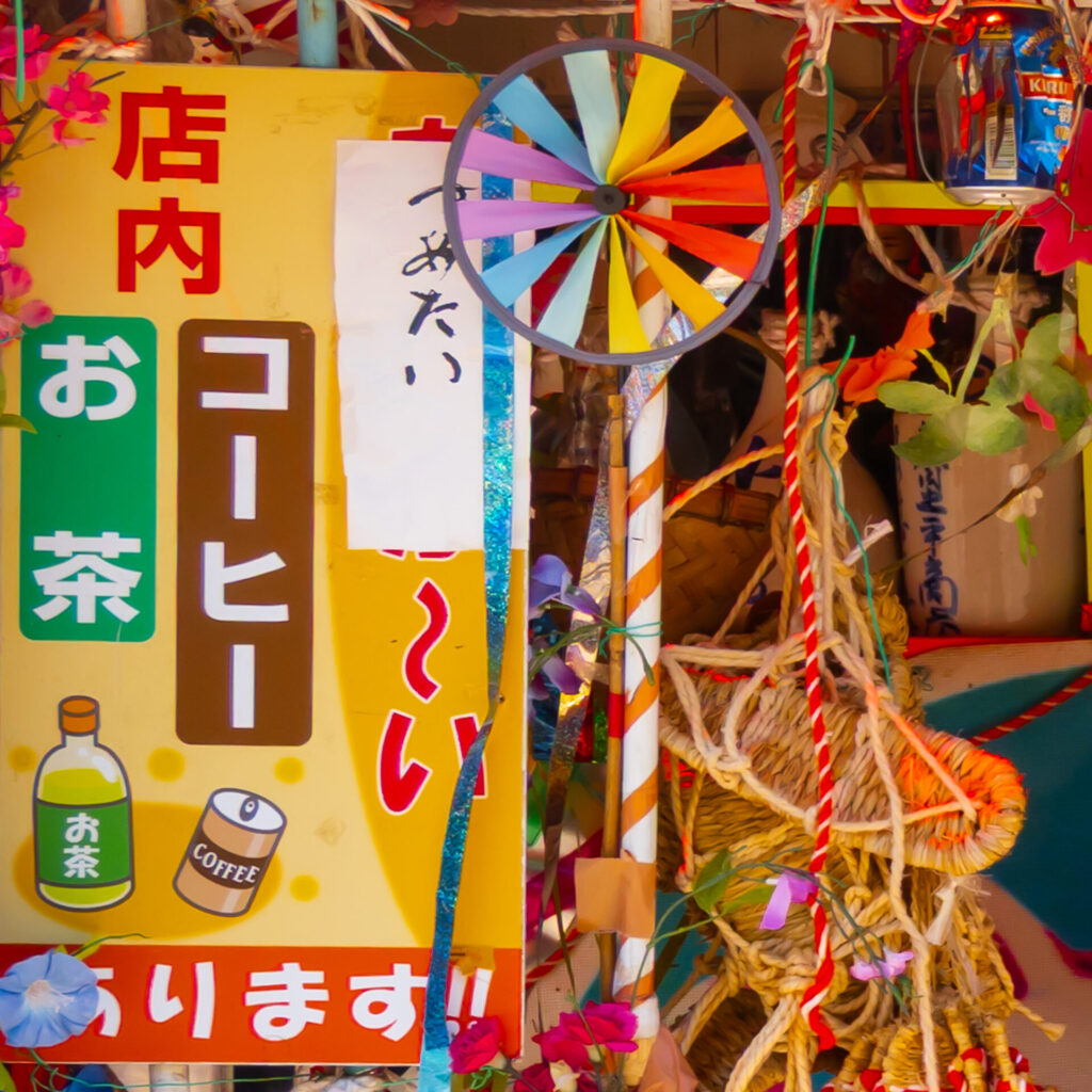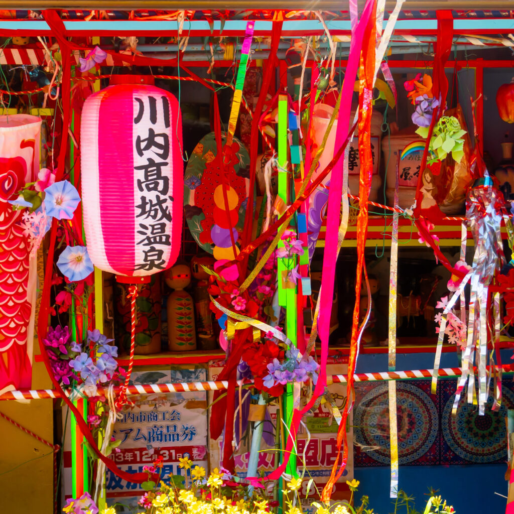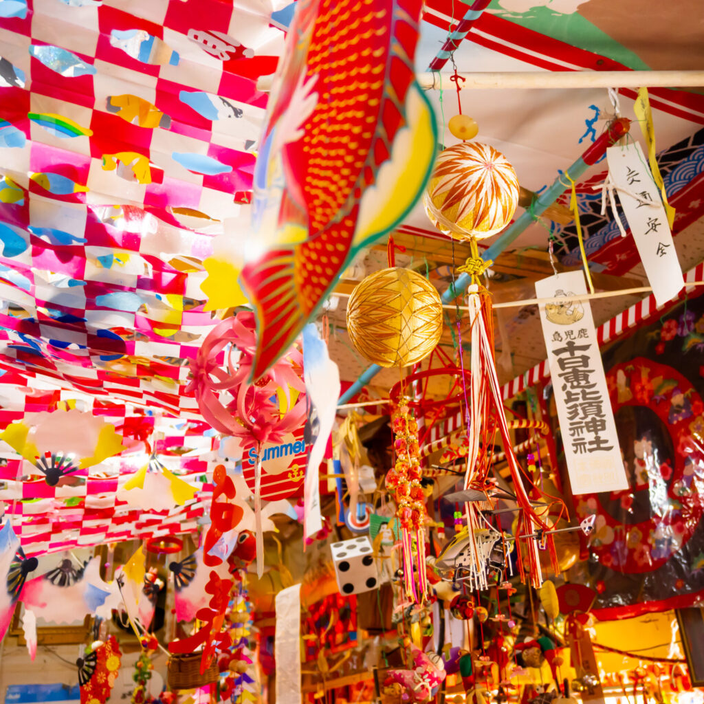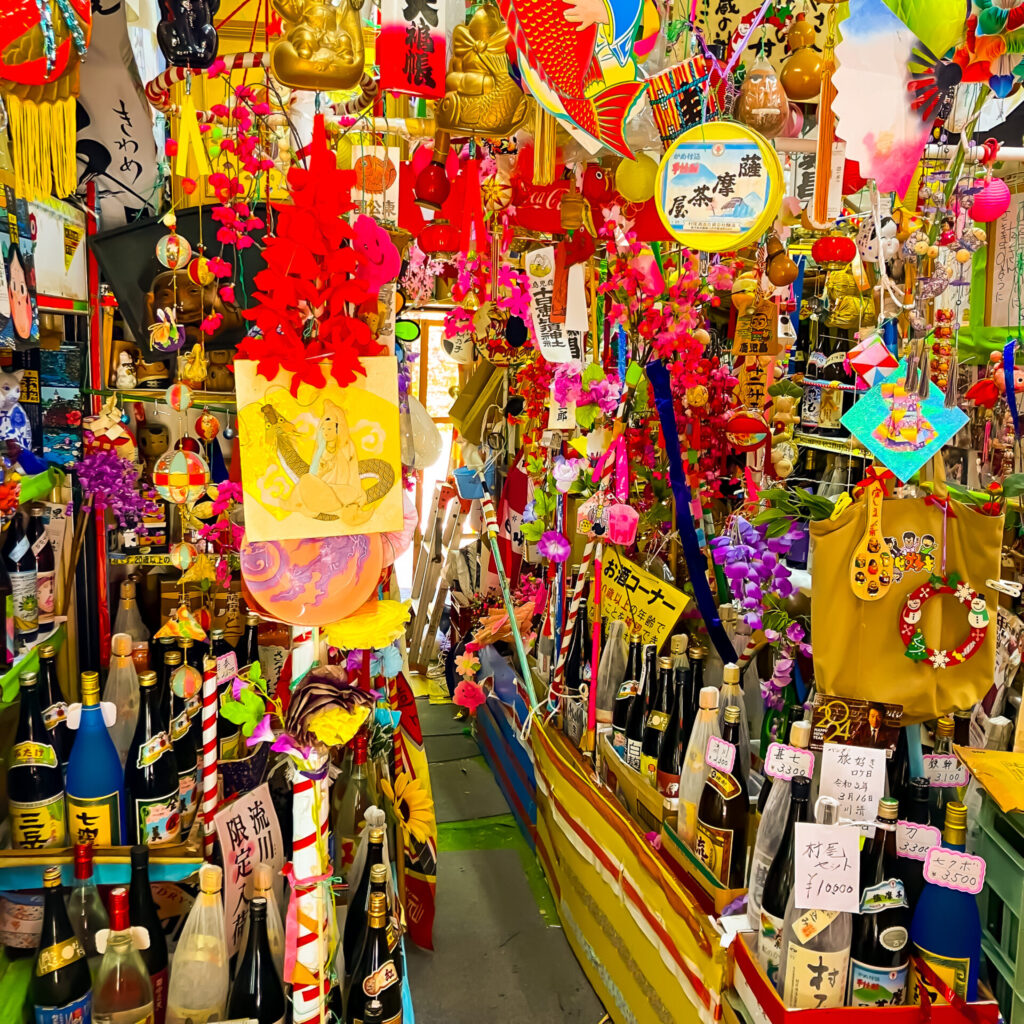 花や提灯、どこかで手に入れたお土産っぽいものなど、細かく見てみると吊るされているものは多種多様。