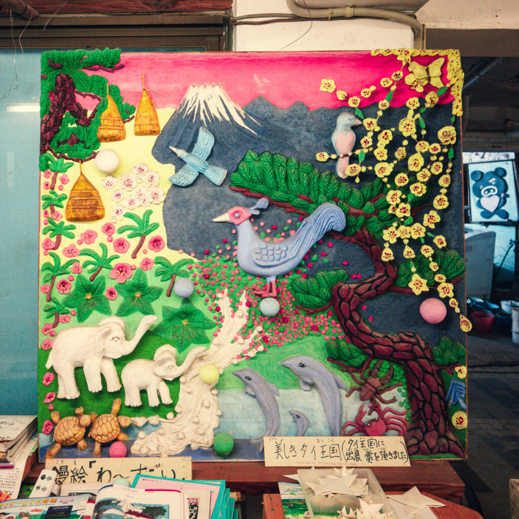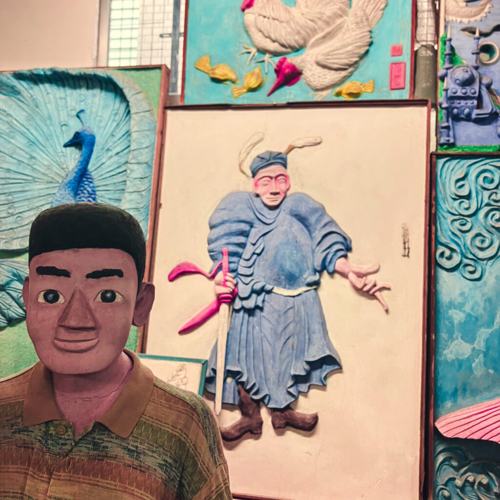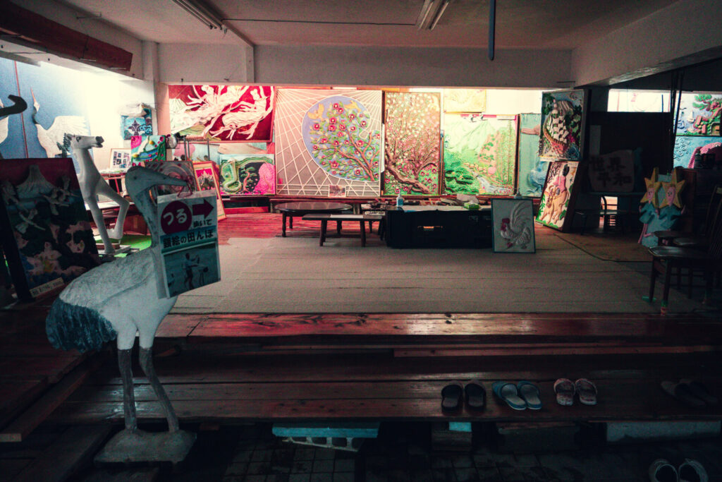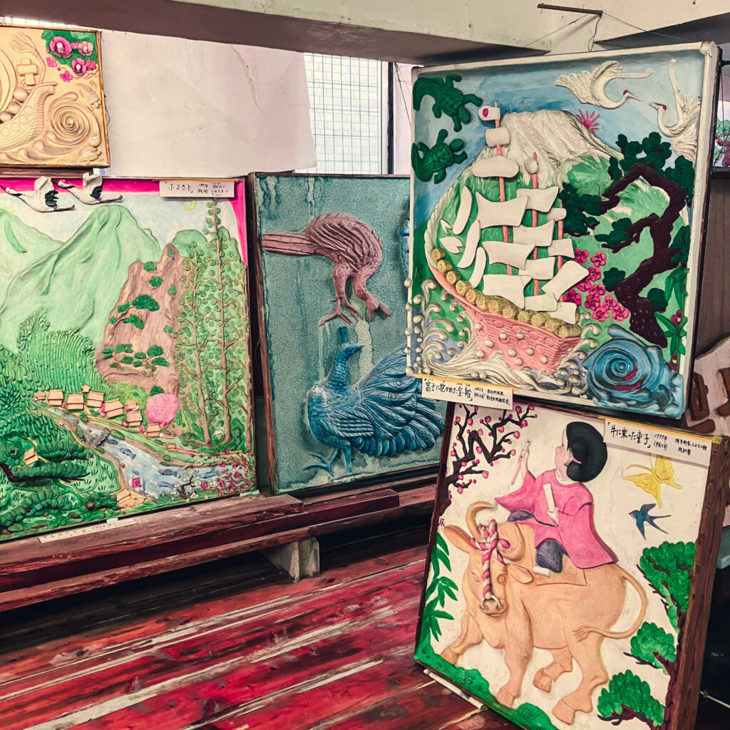 ギャラリーには左官職人である三浦さんが独学で始めた鏝絵の作品が数多く展示されている。