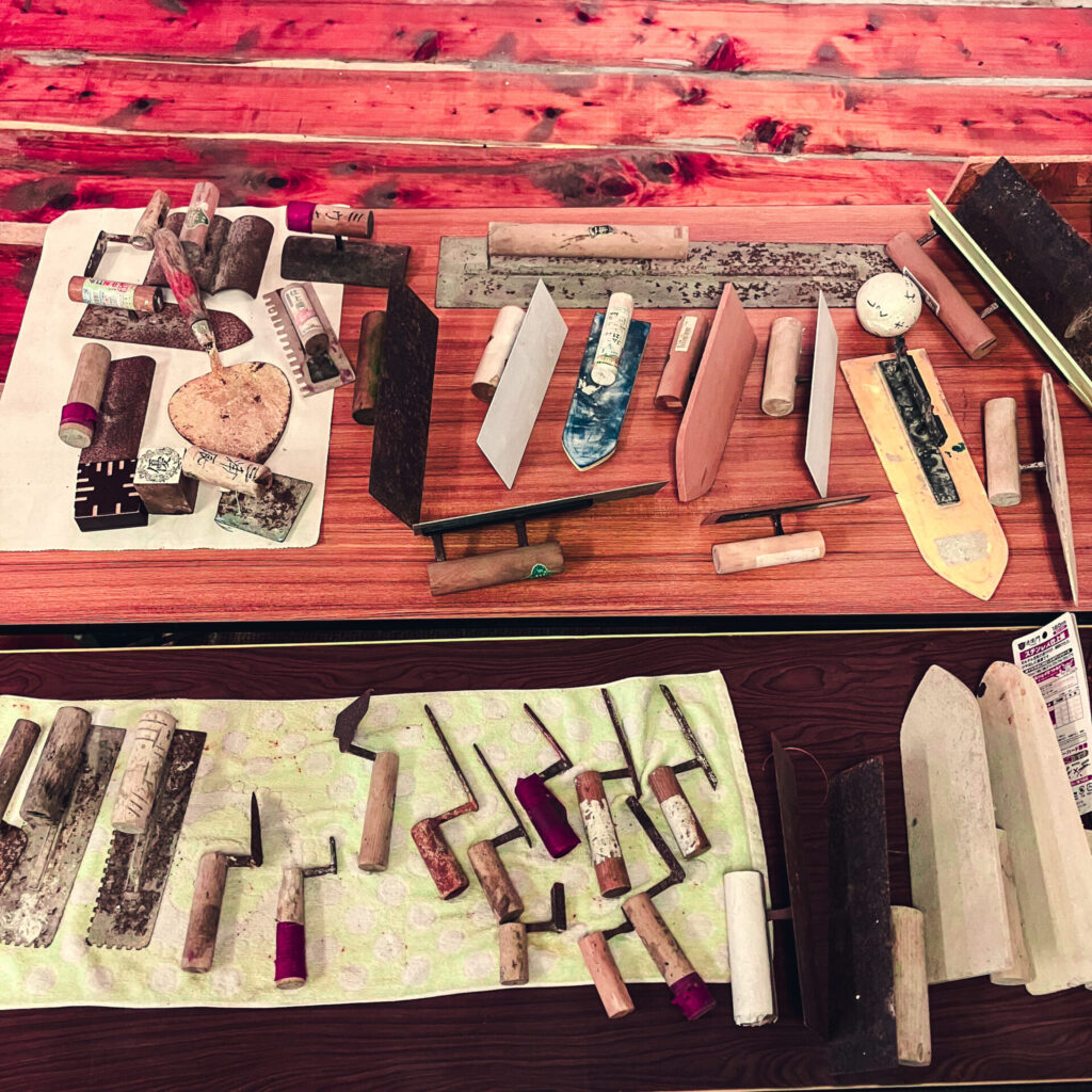 実際に使用している道具も展示されている。こんなにたくさんの種類の鏝を使いこなせるなんてすごい。