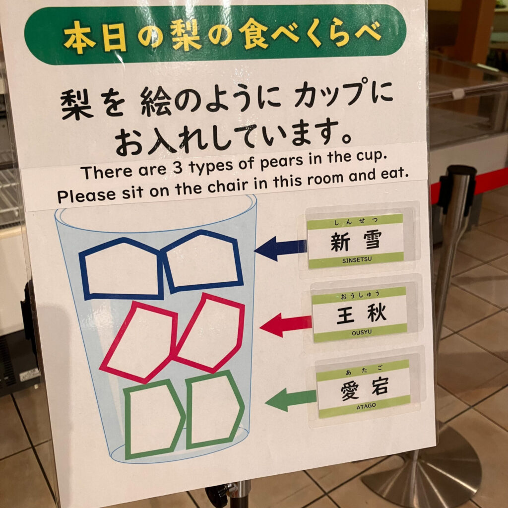 3品種の梨の食べ比べができる。今回は新雪・王秋・愛宕の3種類をいただいた。