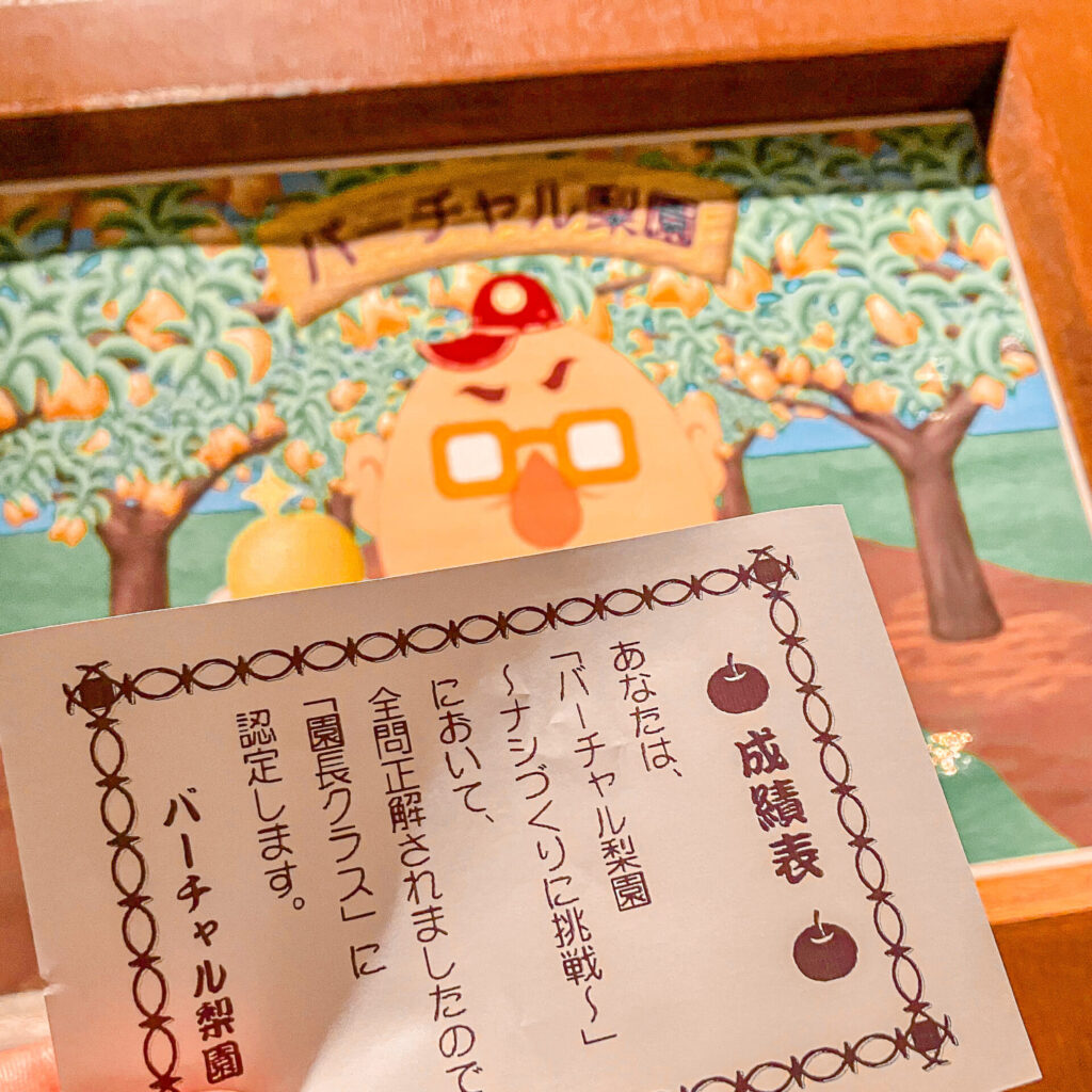 梨づくりクイズに全問正解すると、成績表と梨カードがもらえる。