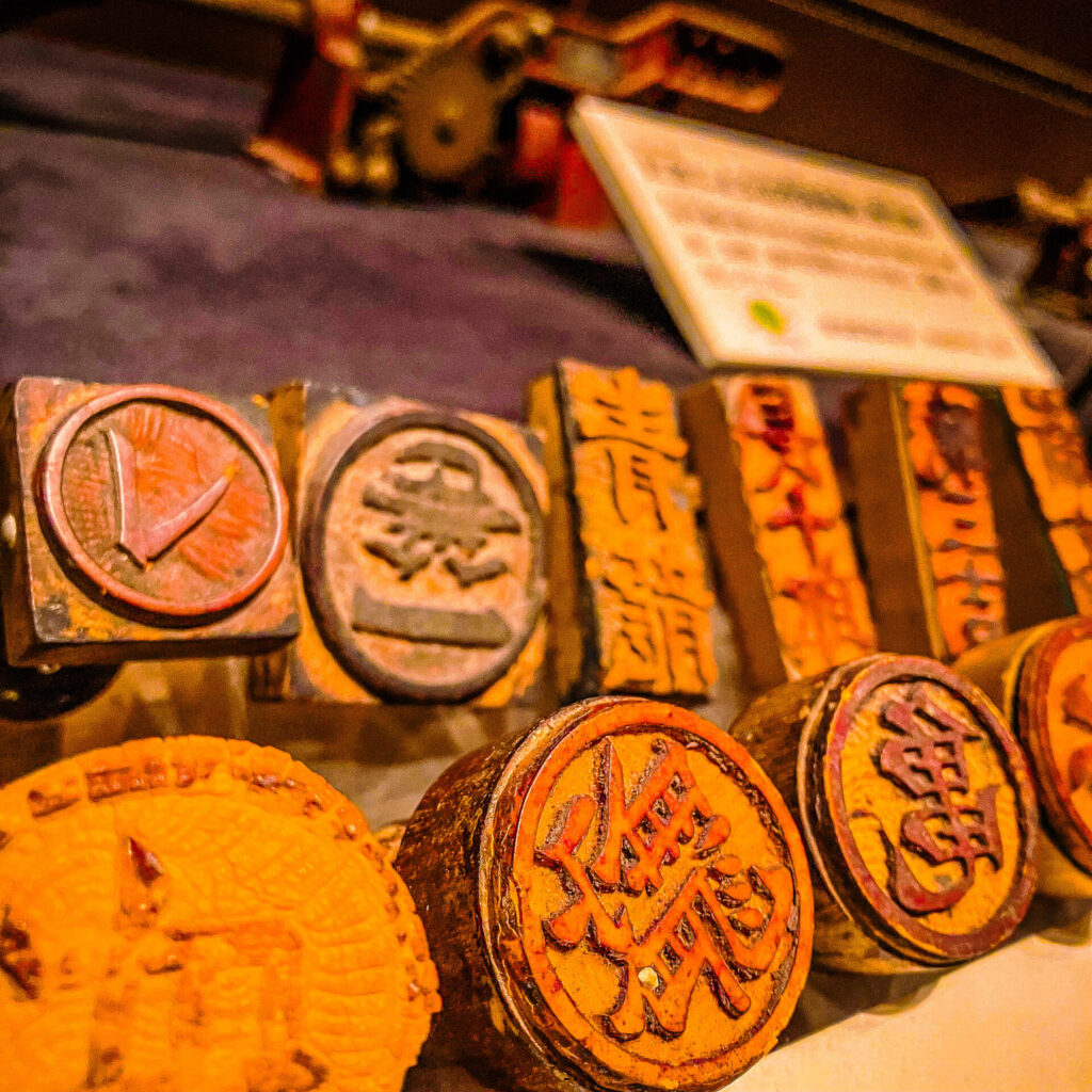 階級を表すゴム印や梨の出荷ラベルなどを展示。