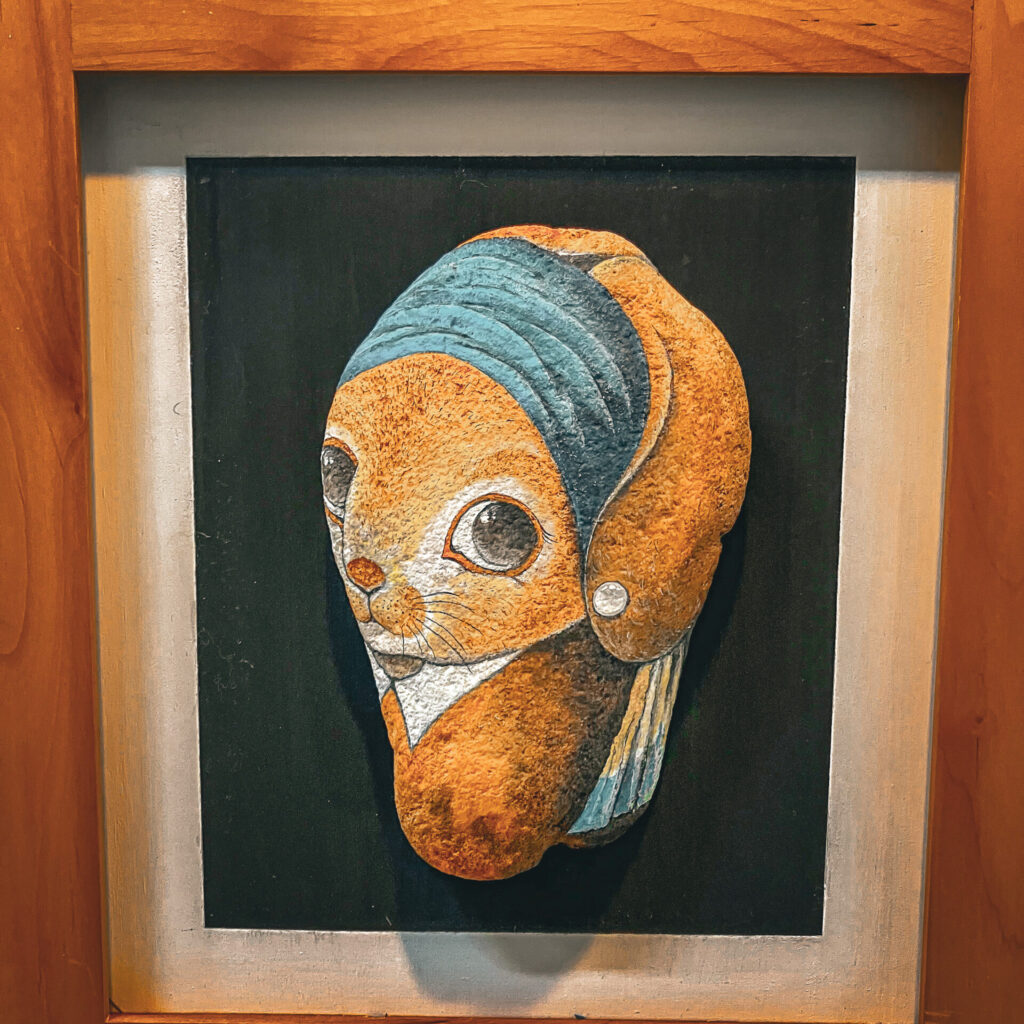 真珠の耳飾りのウサギさん。石に描かれているので、作品が魚眼レンズで見たときのように立体的に見える。