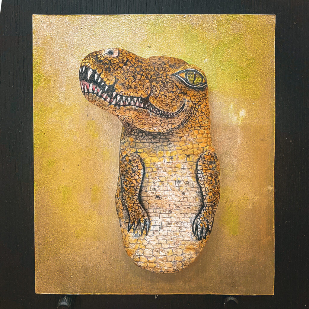 真珠の耳飾りのウサギさん。石に描かれているので、作品が魚眼レンズで見たときのように立体的に見える。