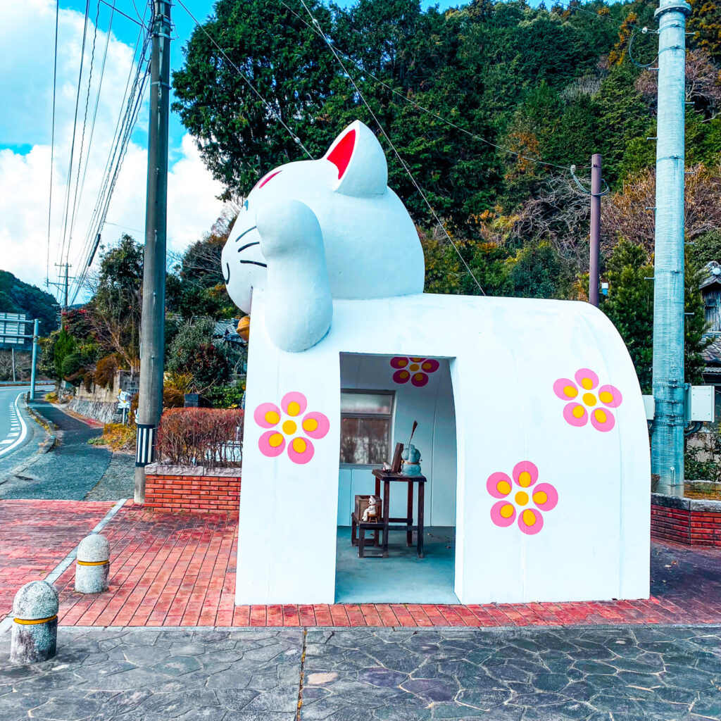 この巨大ネコはバス停の待合所であるが、中には御供物に賽銭箱。