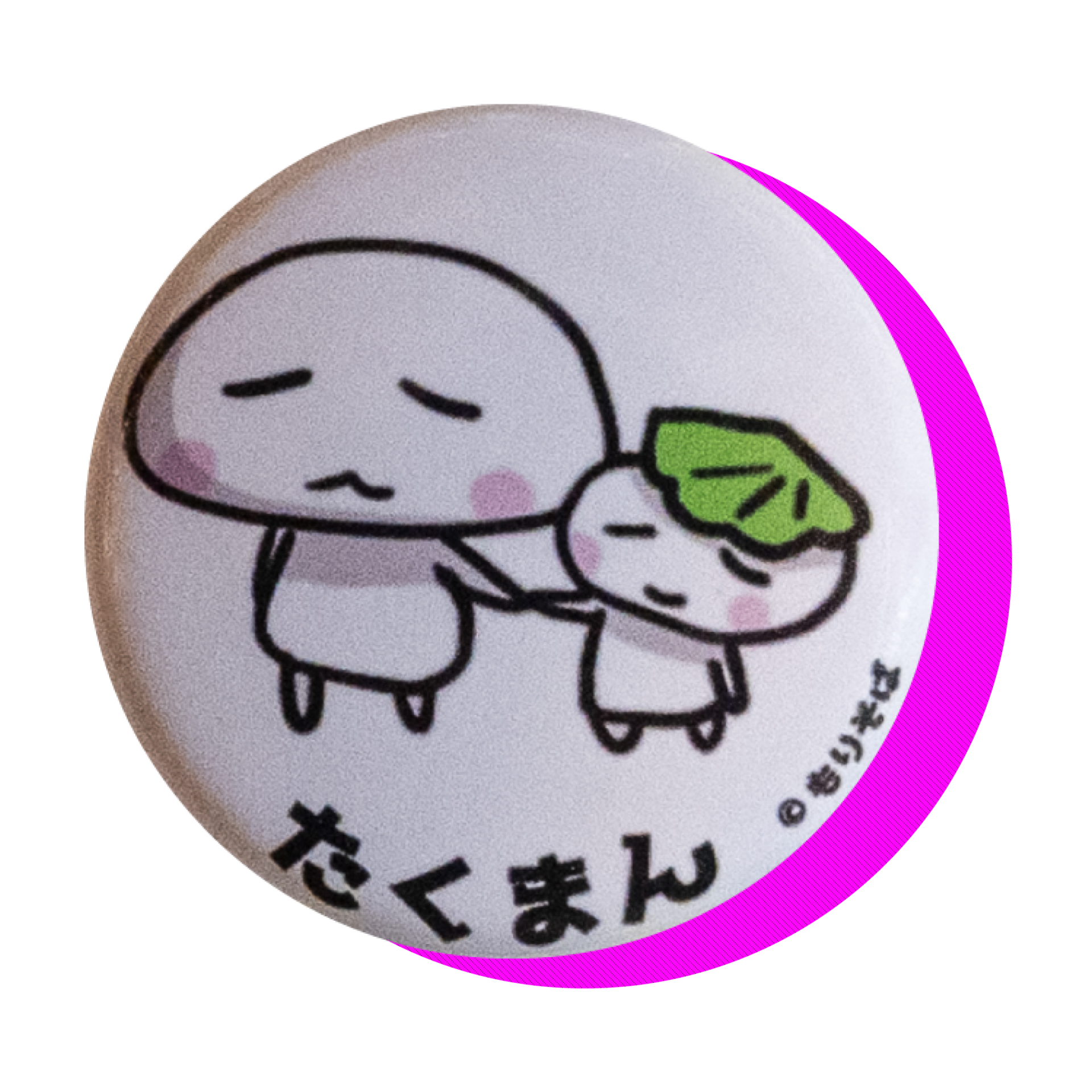 佐賀県の多久聖廟近くにあるお土産屋さんでゲットした缶バッジ。たくまんは多久市名産の多久まんじゅうをモチーフに生まれたキャラクター。缶バッジはデザイン違いで何種類かと、マグネットが置かれていた。