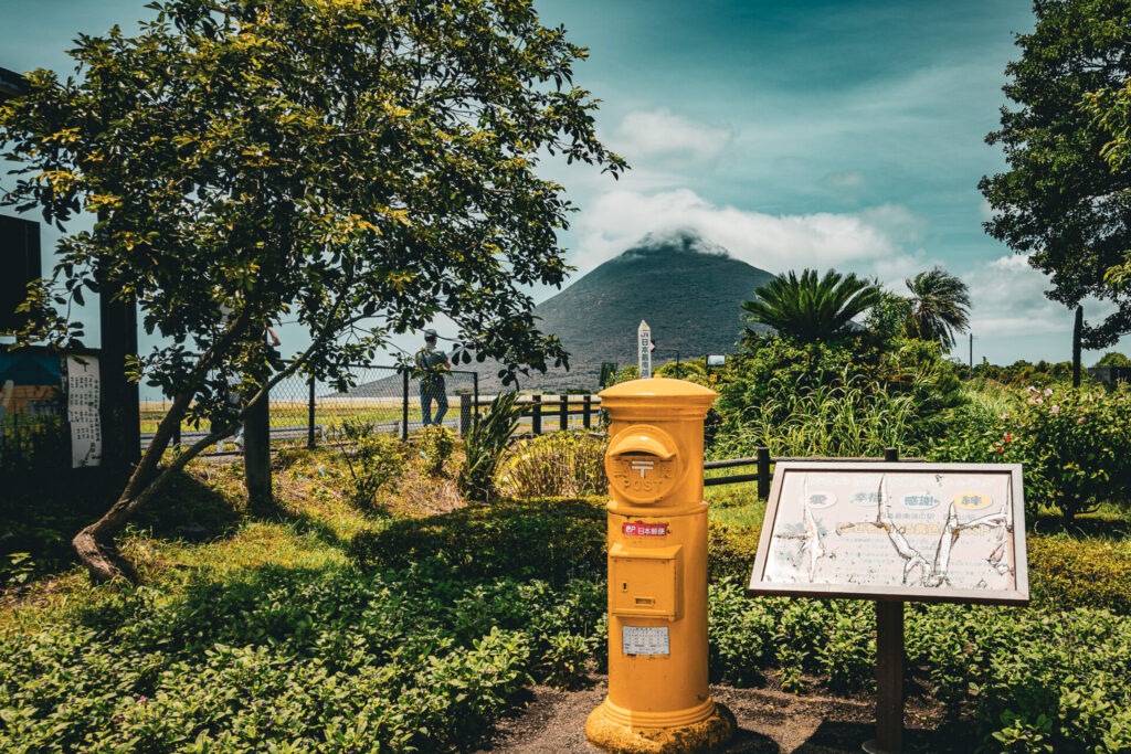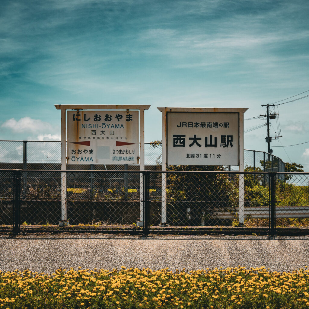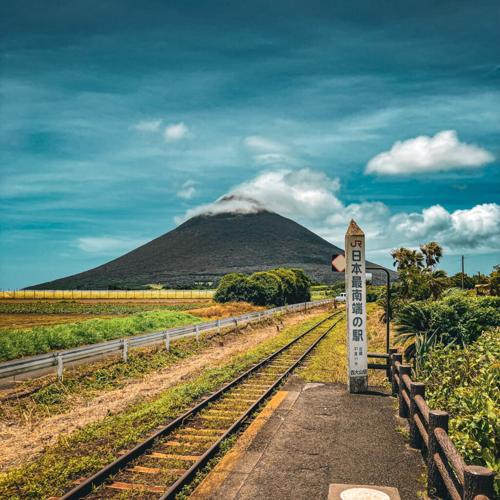 西大山駅は日本最南端の駅。正面に見える開聞岳が美しい。