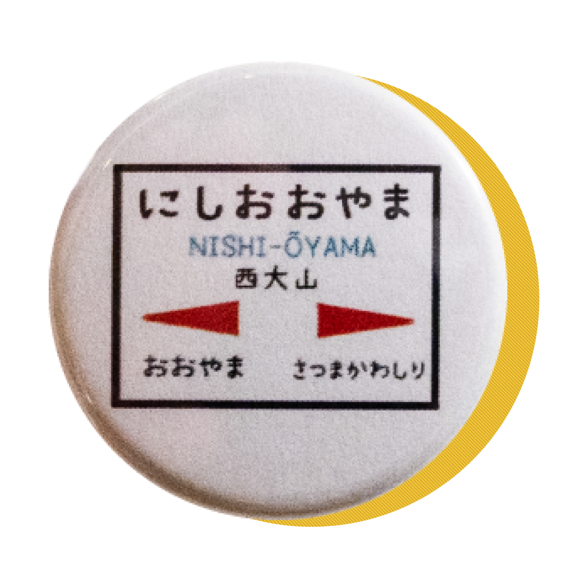 鹿児島県指宿市にあるかいもん市場久太郎で購入した缶バッジ。描かれているのは、かいもん市場のすぐ前にある西大山駅の看板。