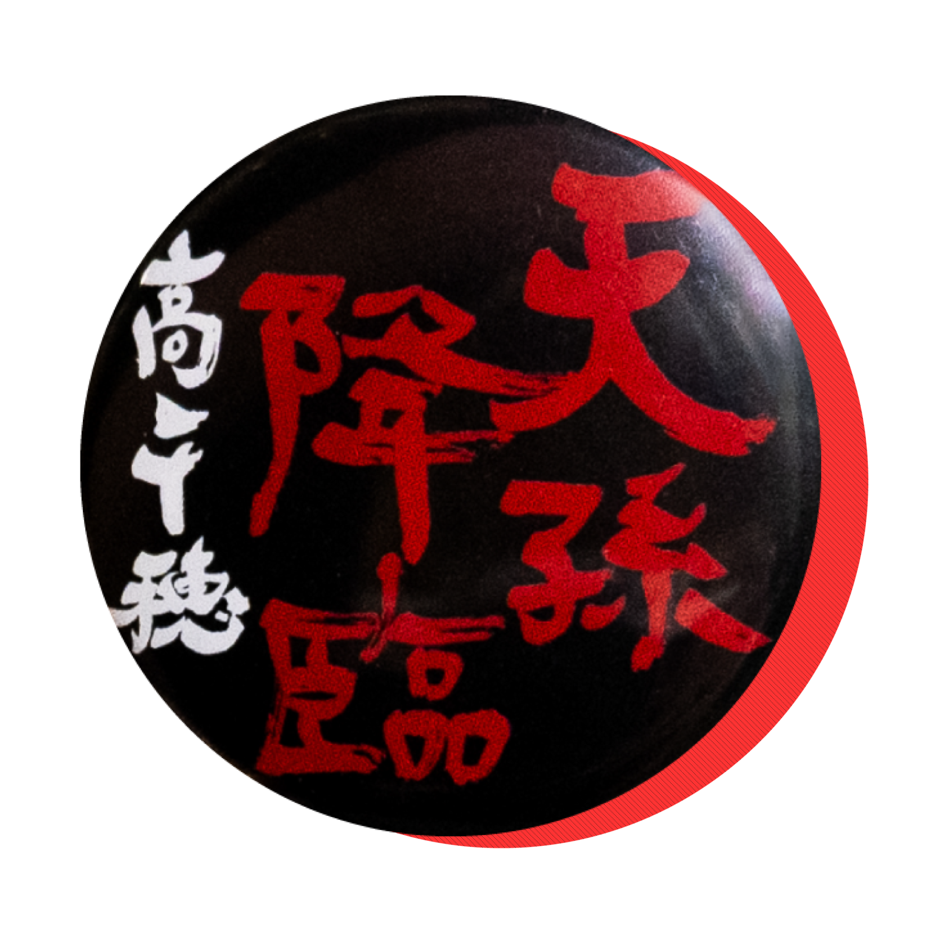 缶バッジは2個セット。手力男と高千穂の文字。つよい。