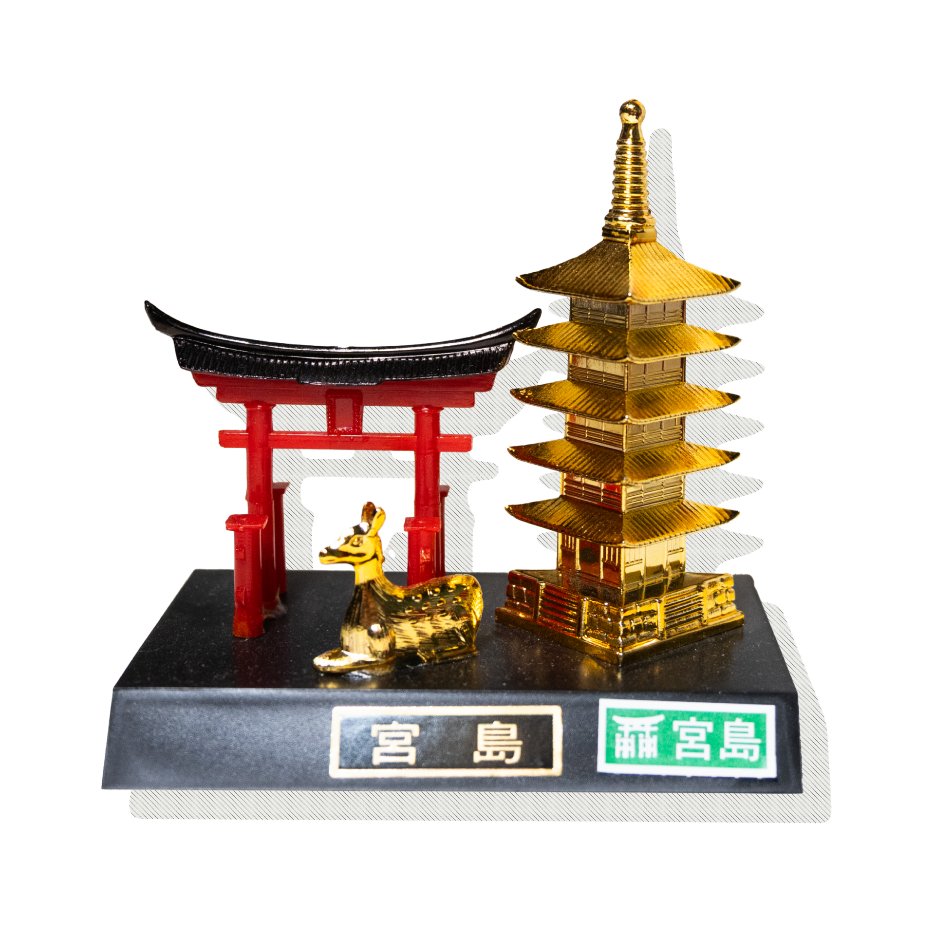 金メッキの宮島の置物。厳島神社の鳥居、五重塔、そして鎮座する一頭の鹿。手のひらサイズの宮島オールスターズ。