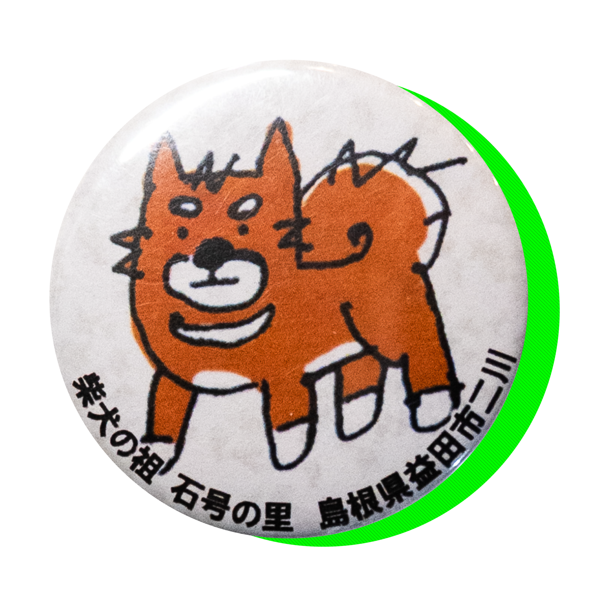 島根県益田市の道の駅サンエイト美都でゲットした缶バッジ。柴犬デザインの缶バッジは、かつてこの益田市美都町にいた「石号(いしごう)」という名の犬をモチーフに作られている。