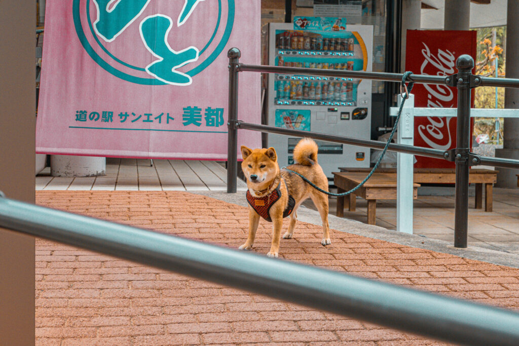 石号は石州犬で、現在の柴犬のルーツの犬だそうだ。ふむふむ、と道の駅で案内板を見ていると、入り口前に本物の柴犬が!