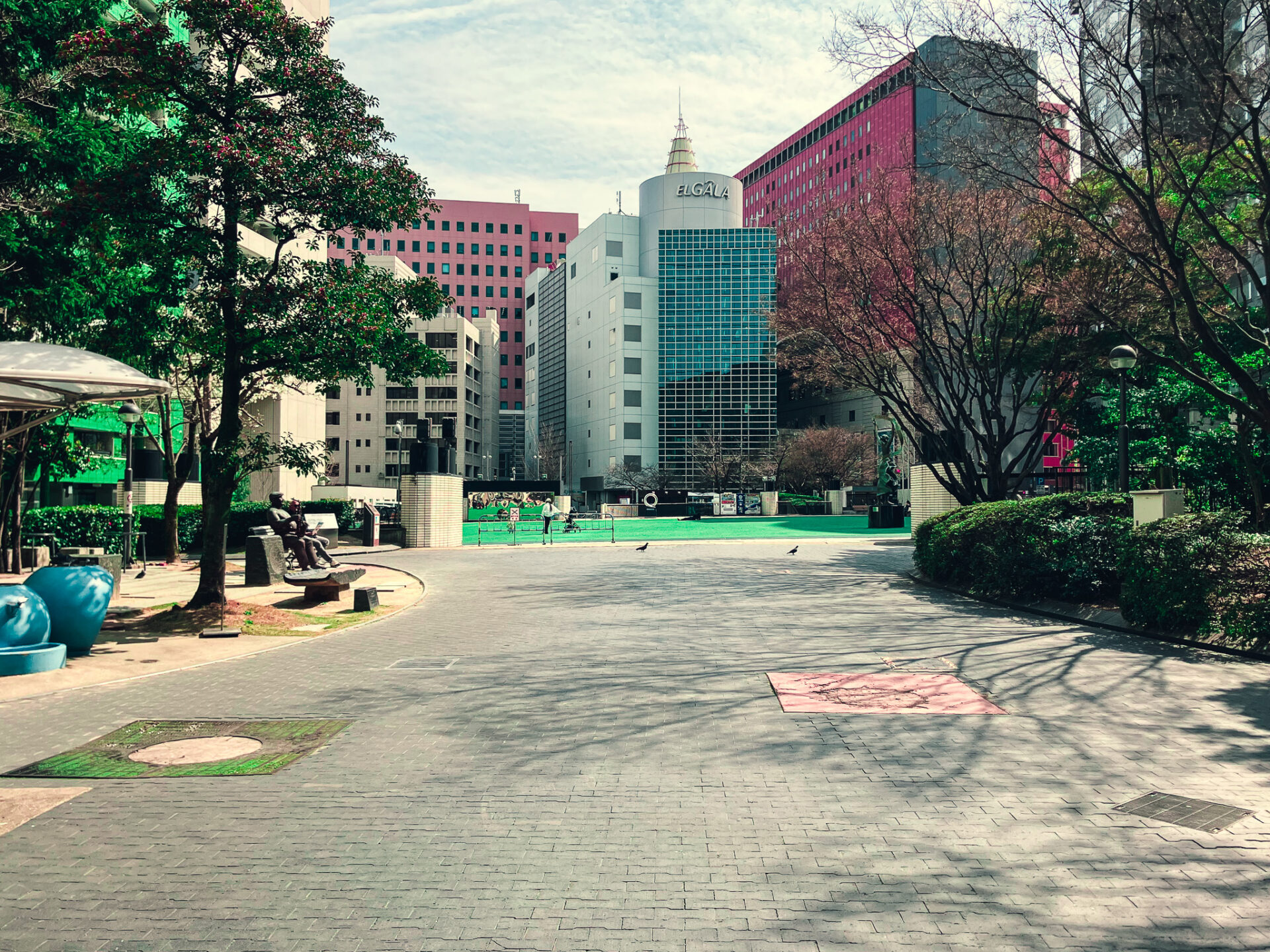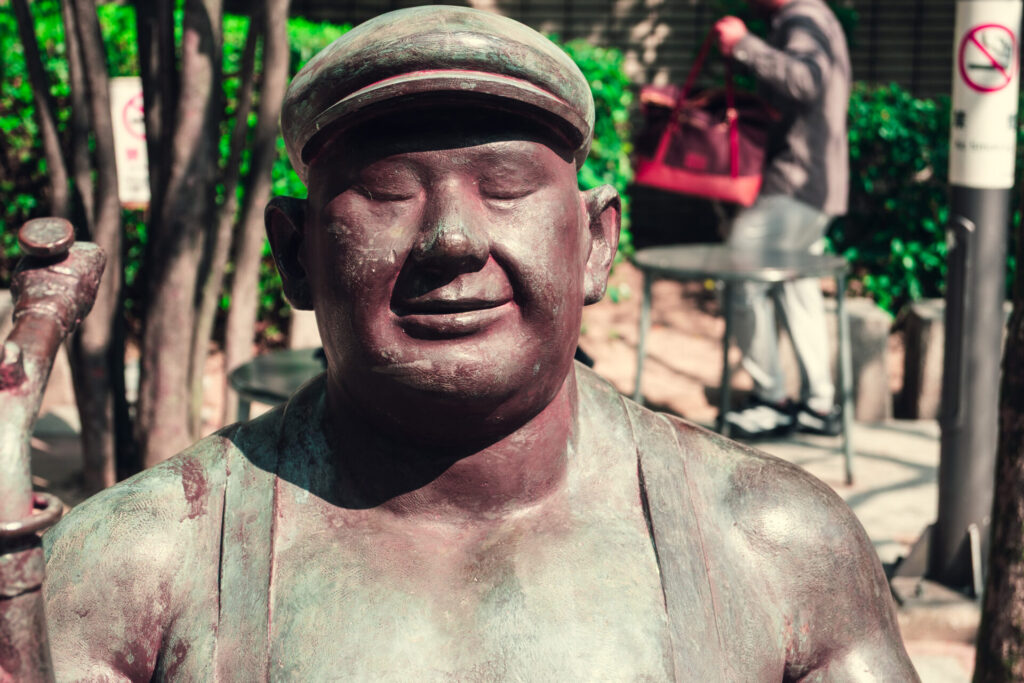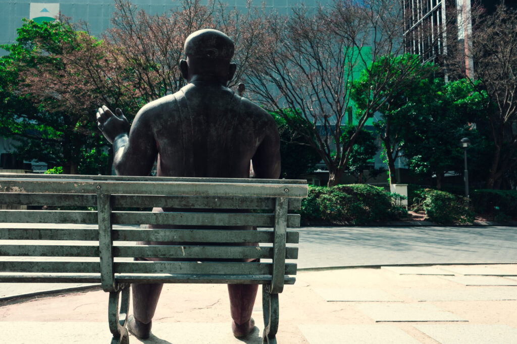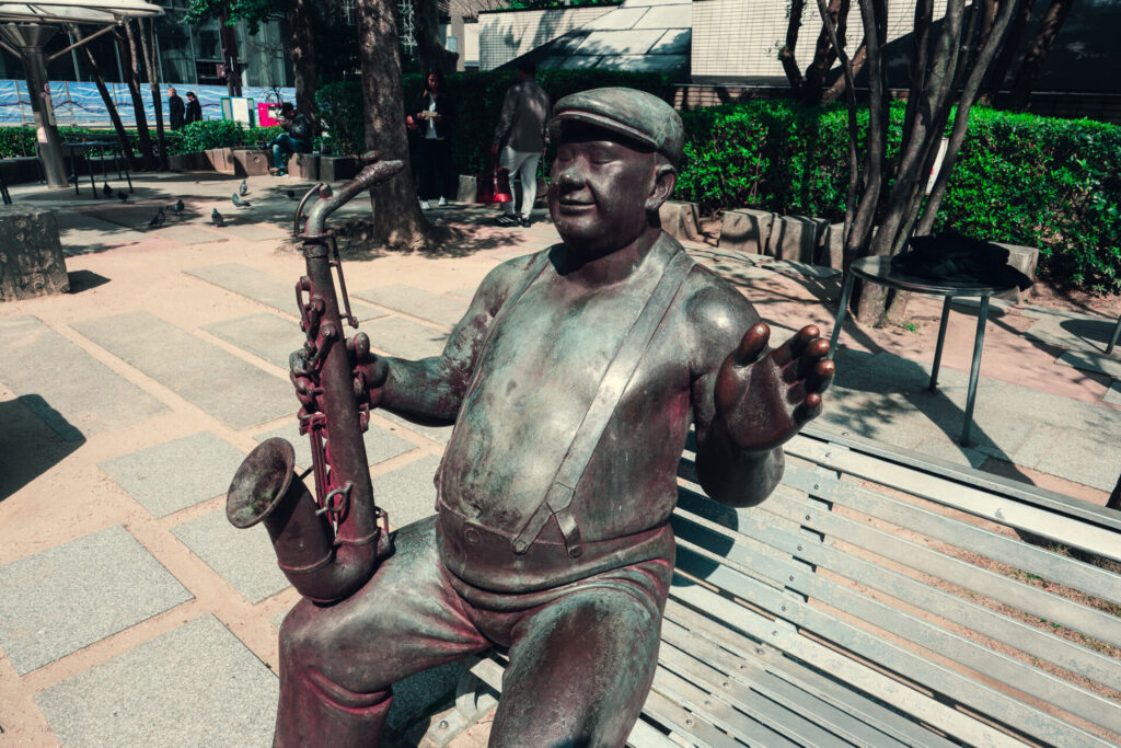 福岡の黒川さんは、ベンチの端に腰掛け、ちょっと休憩中なのか、友人と出会ったのか、サックスを吹くのをやめて手を挙げている姿。その隣には、やはり一席分の「余白」がある。だが、ここ天神においてそのスペースは、記念撮影のためのフォトスポットというよりは、「人生に疲れたサラリーマンが、ふと腰を下ろして無音のジャズに耳を傾けるための特等席」のように見えるから不思議だ。