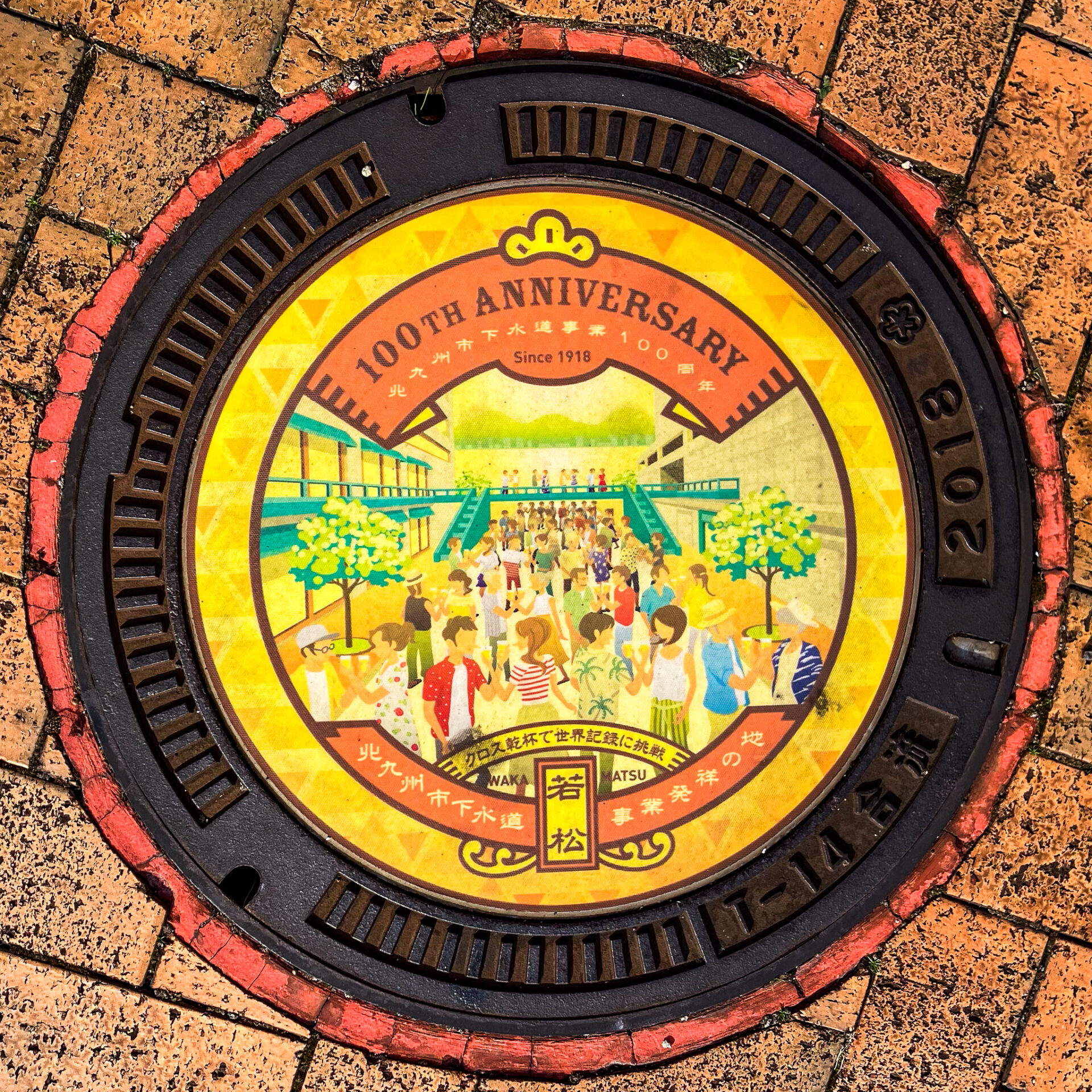 というのも、若松駅周辺にカラーマンホールが集中しているのだ。駅から歩いてすぐの中川ストリート。ここには、北九州市の下水道事業100周年を記念して2018年に作られたマンホールが6種類設置されている。