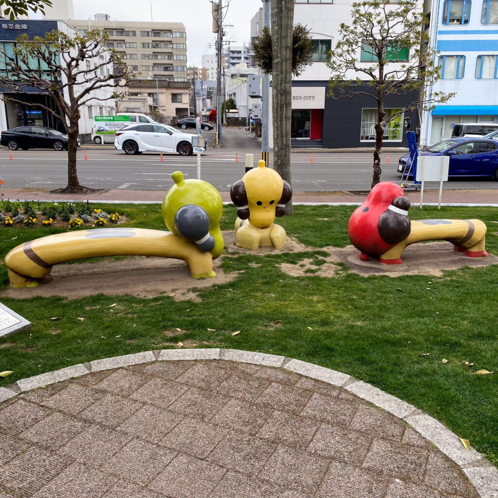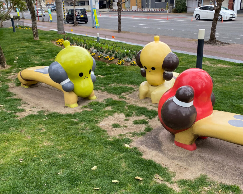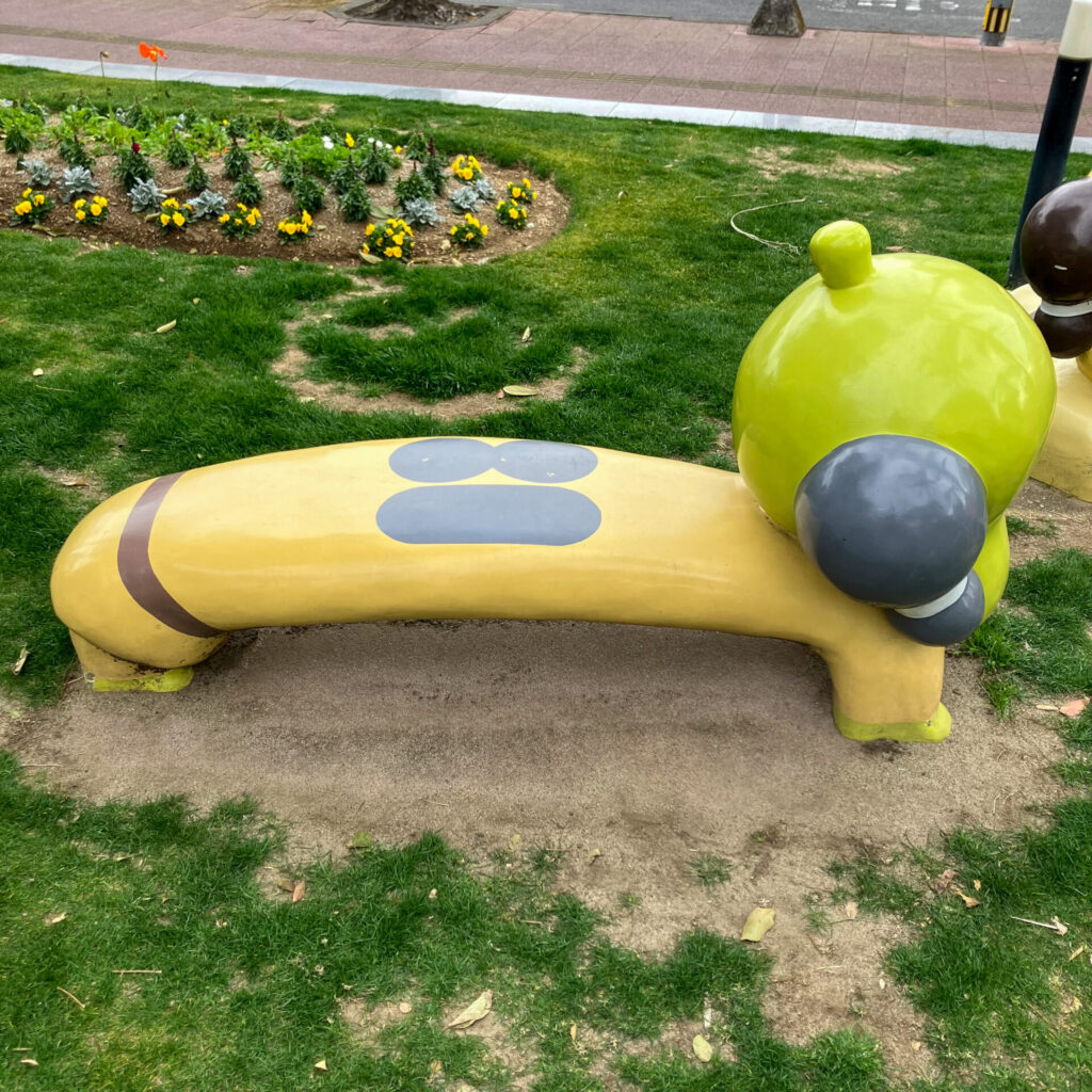 そんな橘公園に設置されているのが、このやベンチ。何かわからない、見たことのない生き物が3体集まって井戸端会議中のようである。記念すべき第1回目にレジェンド級の「やベンチ」を選んでしまったかもしれない。