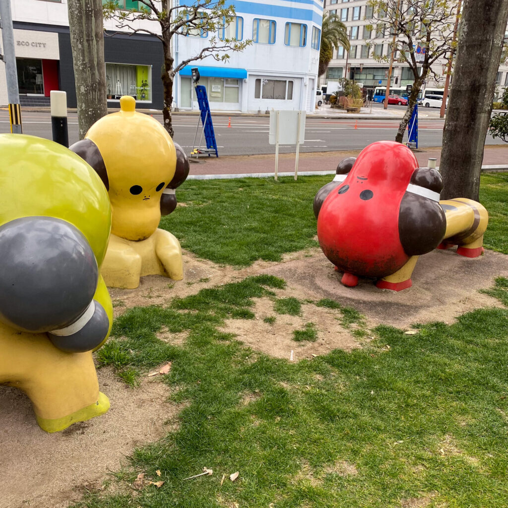 近づいてみてもやはり、異様な光景に変わりない。やはり人間のような生き物っぽい。そして、一つ分かったのは、この髪型はおそらくは、弥生時代の人と同じ髪型。「みずら」だろう。確かに宮崎県といえば神話の舞台である「高千穂」が有名である。中心地の宮崎市でも「高千穂」をフルで支援しているのだろう。