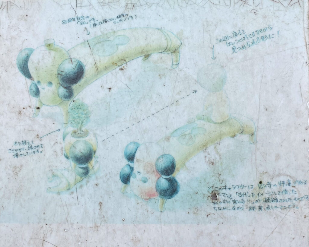 このやベンチは平成17年3月に設置されたもので、ベンチの作品名は「憩いのP-MEN」作者は中村希さんである。宮崎市制80周年を記念して設置されたもので、まちなか彫刻アイデアの優秀作品とのことである。