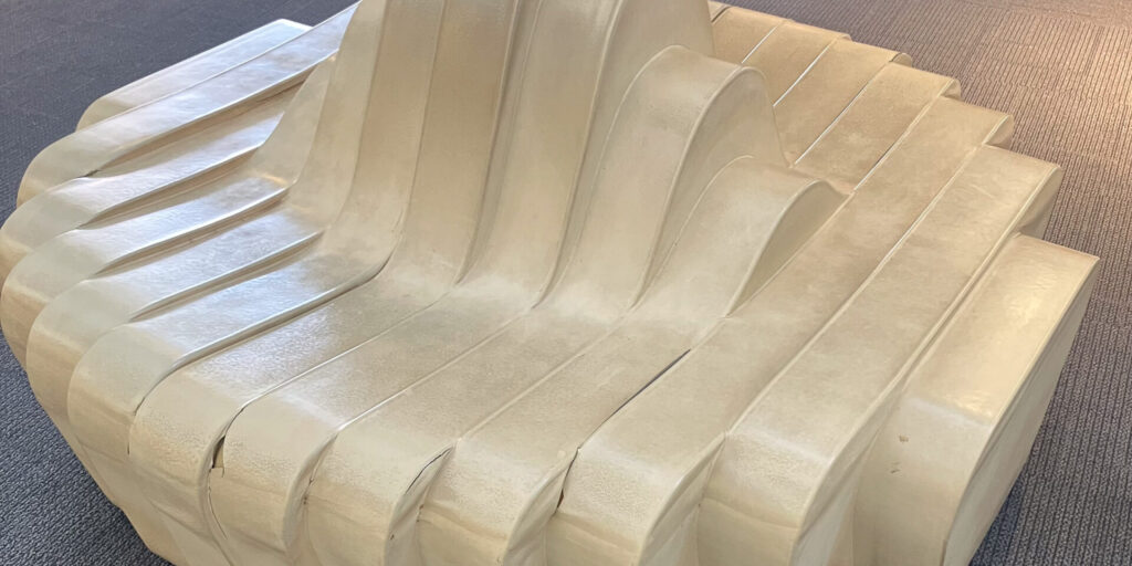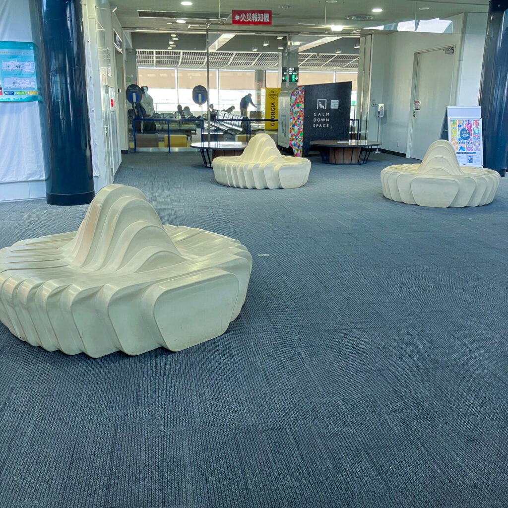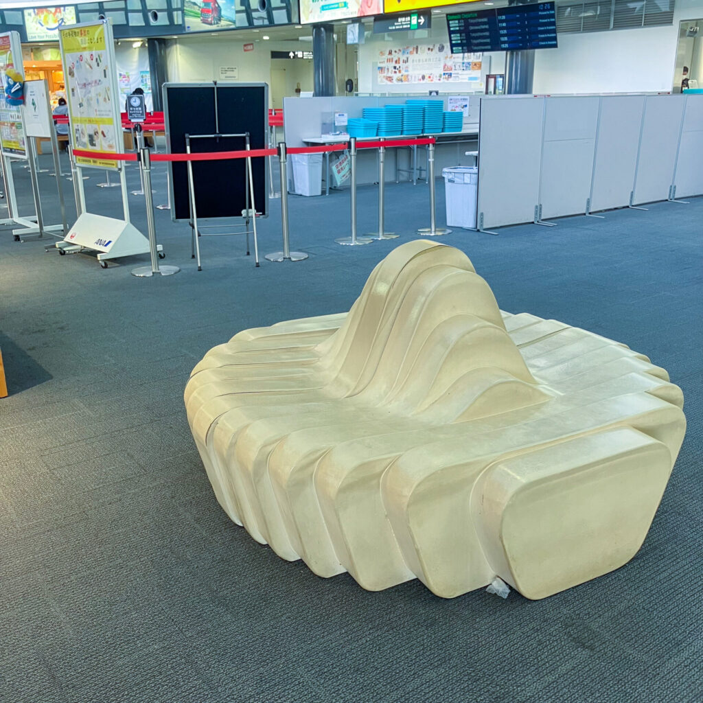 最初、「うわー!すごい!うどんベンチだー!」ってはしゃぎながら座ったものの、改めて考えてみると、香川県だからってうどんぽく見えたベンチを勝手に「うどんベンチ」と言ってはしゃぐのは失礼なんじゃないか?デザイン的にシュッとしてるから、スタイリッシュでおしゃれなベンチなのでは?ここは空港だし。と思って調べてみたところ、金剛株式会社さんが作られた、うどんがコンセプトのソファとのことである。