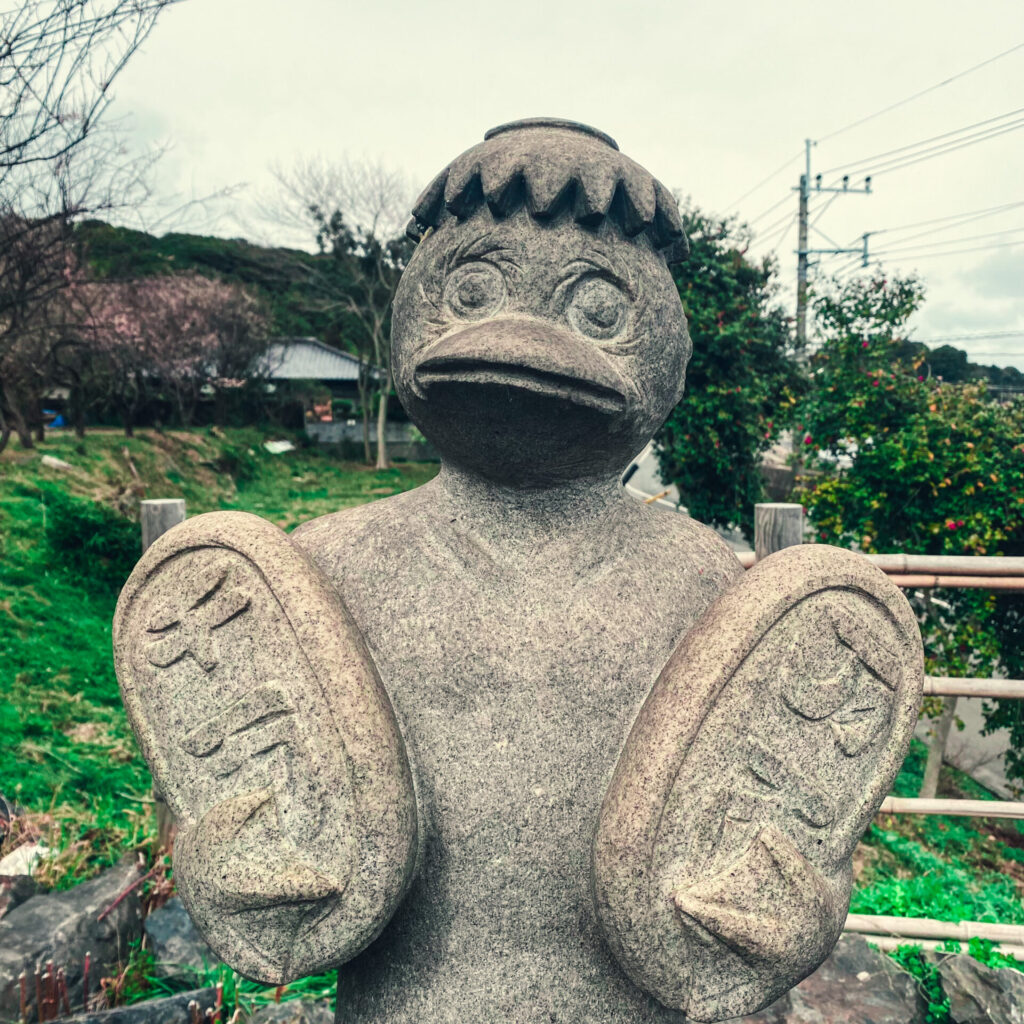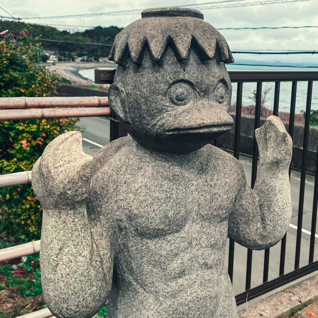 河童という妖怪は、昔から全国各地で確認されているが、大抵は流れの早い川など、危険性が高い川に近づかない様にするための口実に使われることが多い。大抵の場合は淡水だが、ここの河童が見つめているのは大海原。海水であり、全国的にも結構珍しい河童だと思われる。