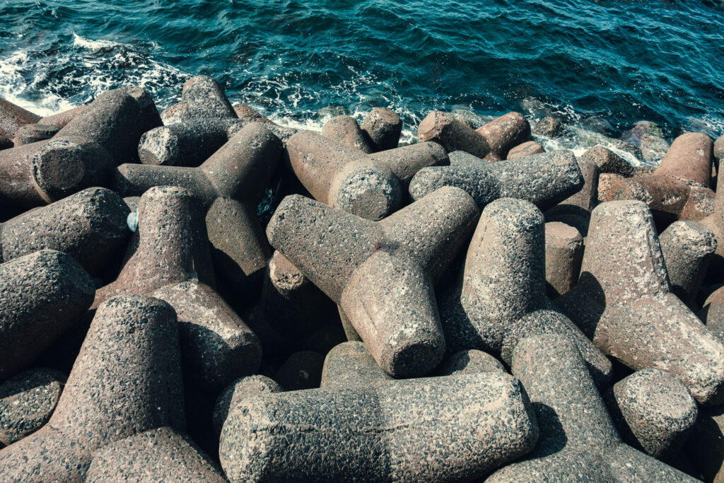 消波ブロックとは、その名の通り、海岸や港湾で波のエネルギーを吸収・分散させ、護岸や堤防を保護するコンクリート製のブロックだ。一般的には「テトラポッド(商標登録)」の名が有名である。