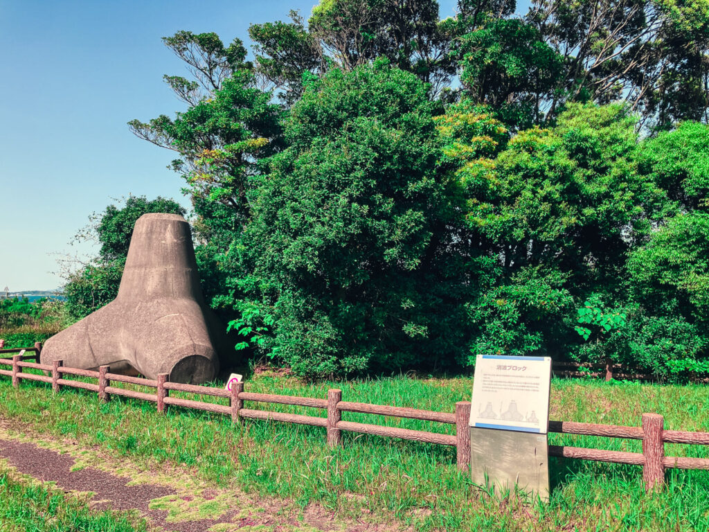 その施設の敷地内に置かれているのは、巨大な消波ブロック。(写真ではちょっとサイズが分かりにくいけども。)