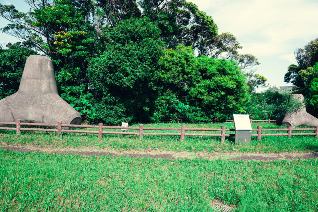 場に置かれた消波ブロックは、一見するとシュールな現代アートのようだが、実はここから沖合8kmに浮かぶ『白島国家石油備蓄基地』で実際に使用されているものの実物大模型である。日本のエネルギーの生命線である石油。それを積んだ巨大な貯蔵船を玄界灘の荒波から守るため、32トン、そして日本最大級のサイズである64トンという規格外のブロックが投入されているのだ。海底から海面以上まで積み上げられたその高さは、実に13.5m。どんな高波も寄せ付けない鉄壁の布陣である。