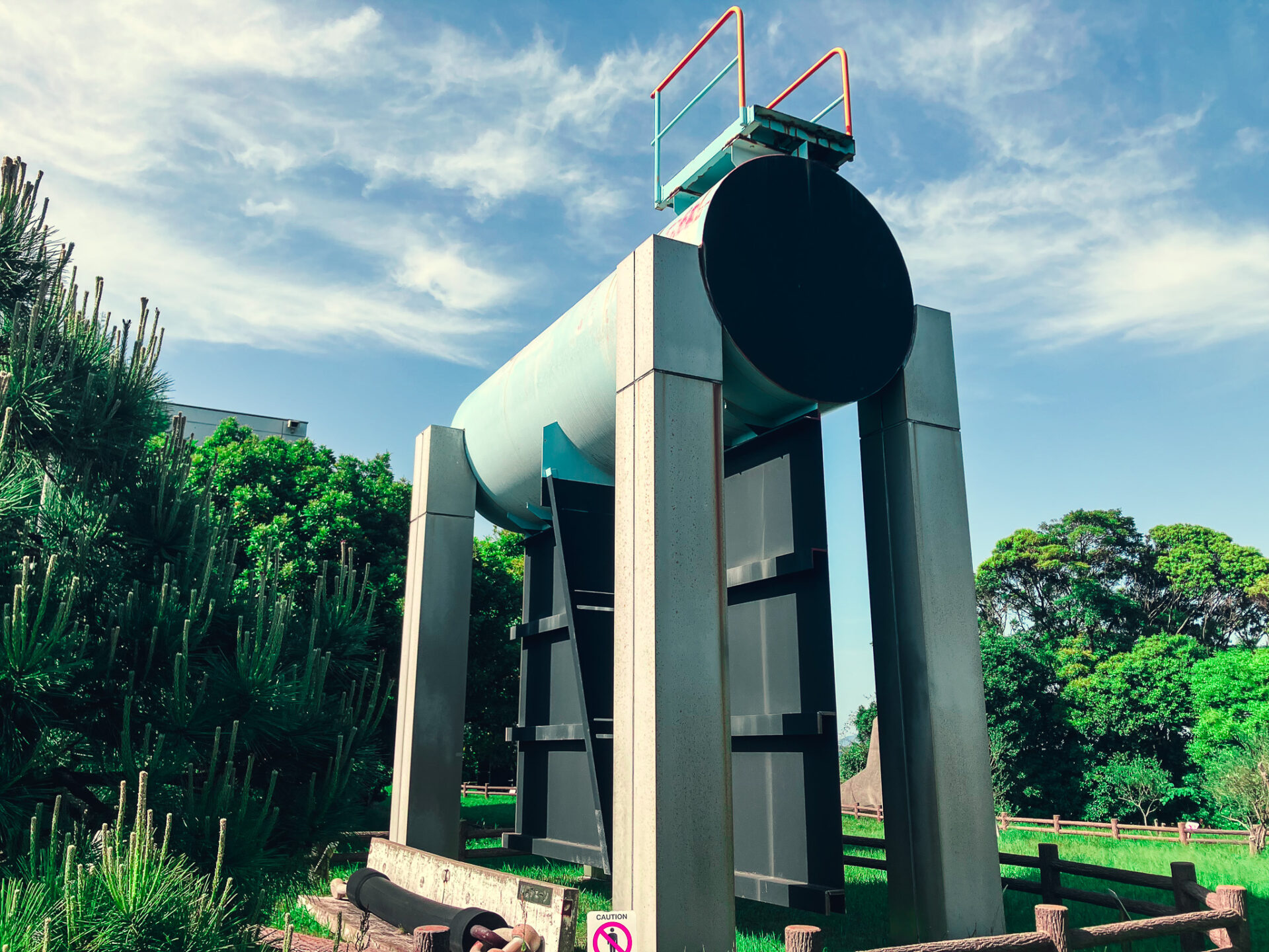 さらにその横には『防油堤』や『船の二重殻構造』の実物大カットモデルまで展示されている。国家機密レベルの壮大なインフラ設備の一部が、広場にしれっと、かつ無造作に置かれているこの空気感は、QQマガジン的に「サイコー」の一言に尽きる。