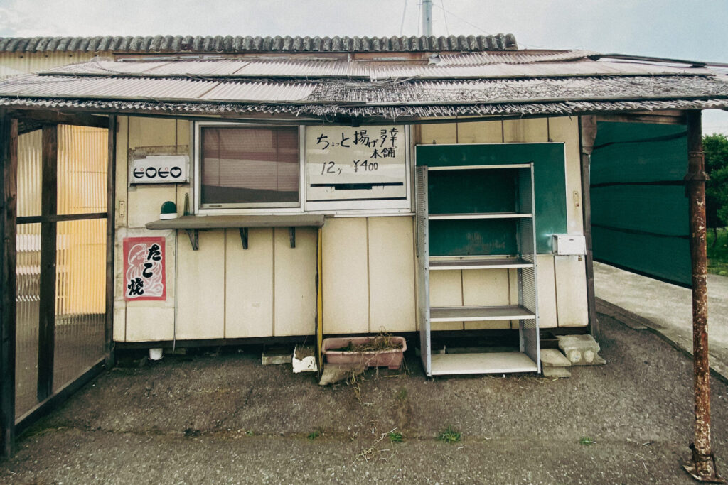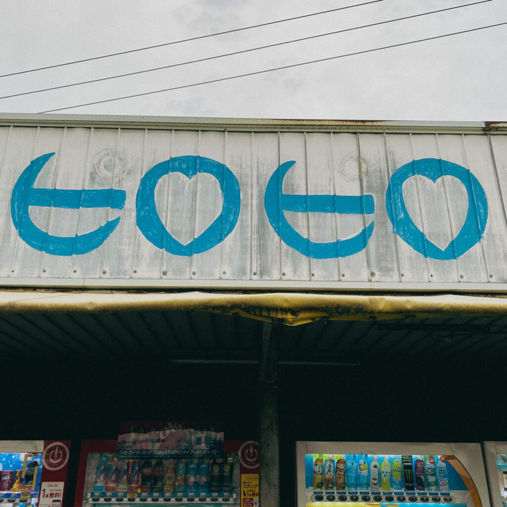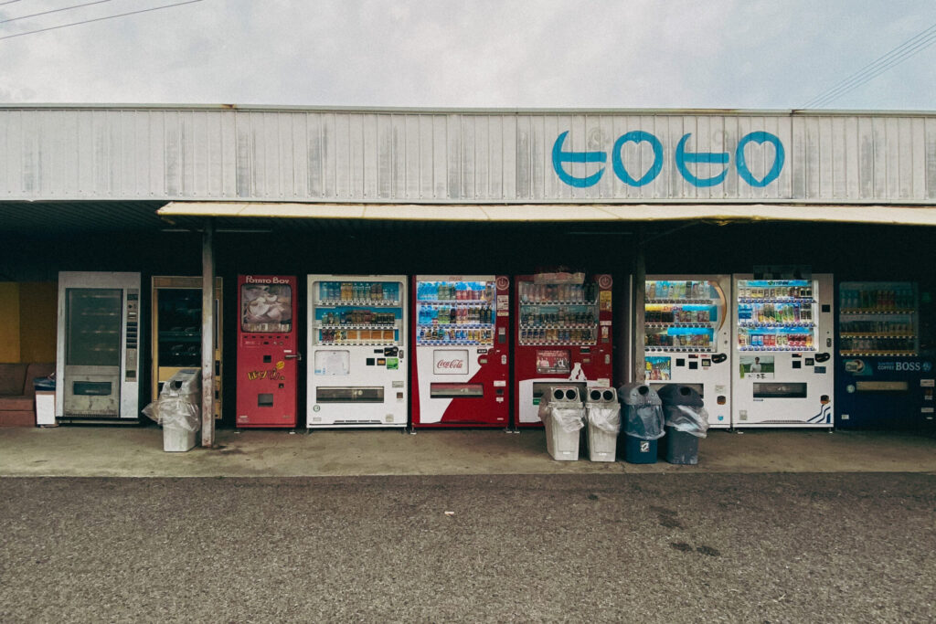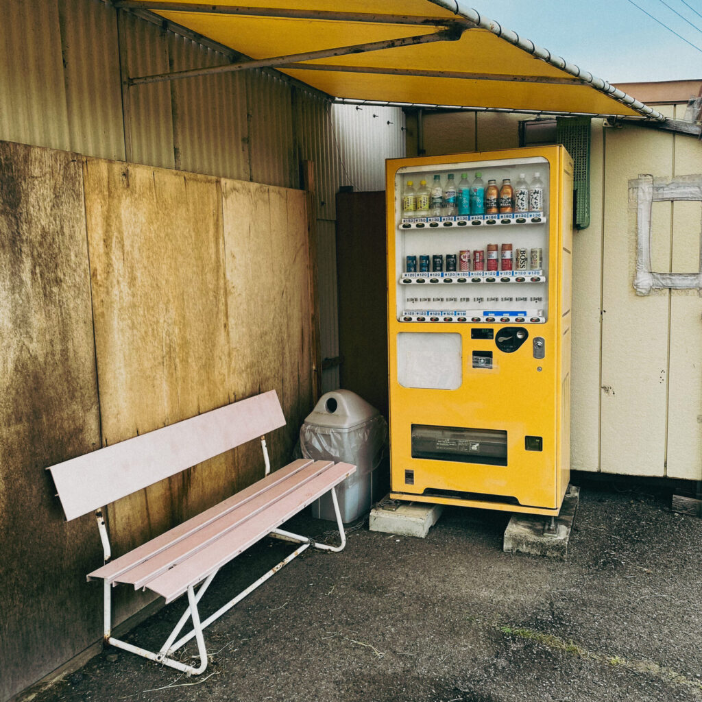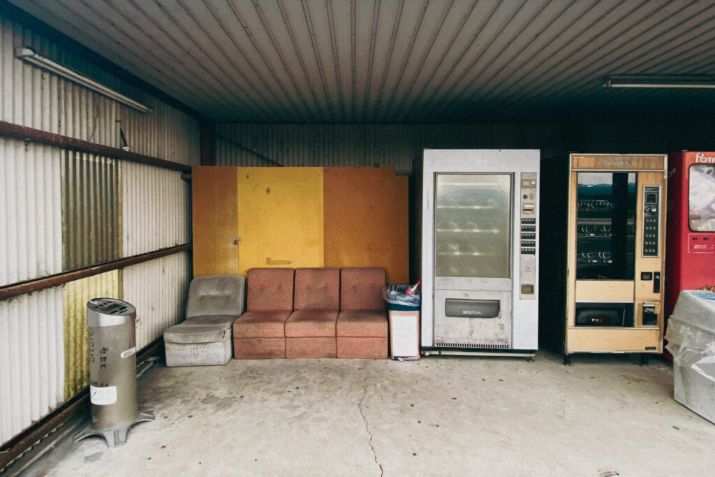 倉庫のようなトタンの建物。近寄ると自販機コーナーだとわかる。