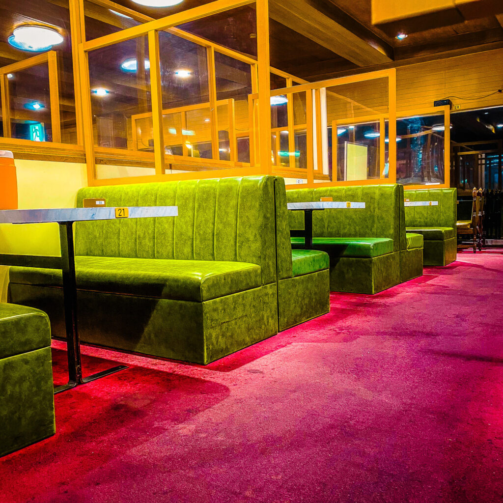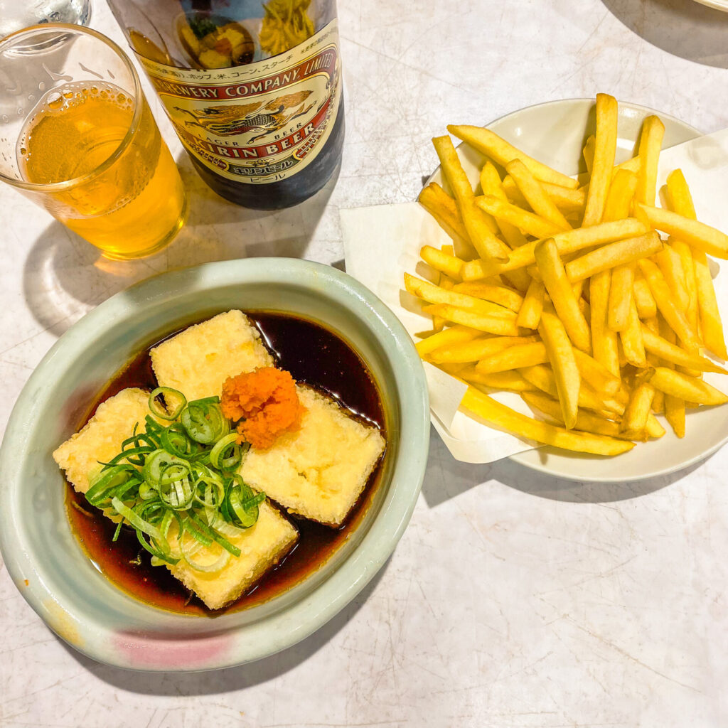 レトロなグリーンのシートでいただいたのは、泊まるからこそできる、ビールとおつまみの組み合わせ。