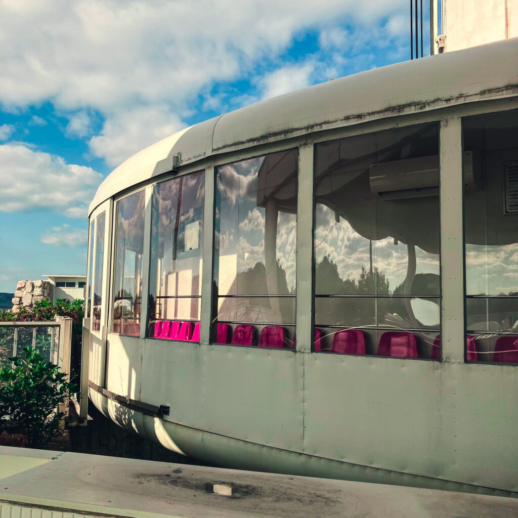 登っていくと隣には、これまた素晴らしくレトロな色合いと形状の宇宙船?いやUFOか。とにかく回転するドーナツ型の展望室が現れる。