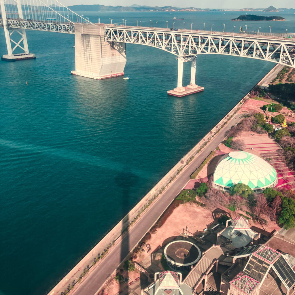 香川県坂出市にやってきた。岡山から瀬戸大橋を渡ってきて四国に入ったー!とテンションが上がるとともに最初に目にするタワーが、この瀬戸大橋記念公園内にある回転式展望塔の瀬戸大橋タワーである。