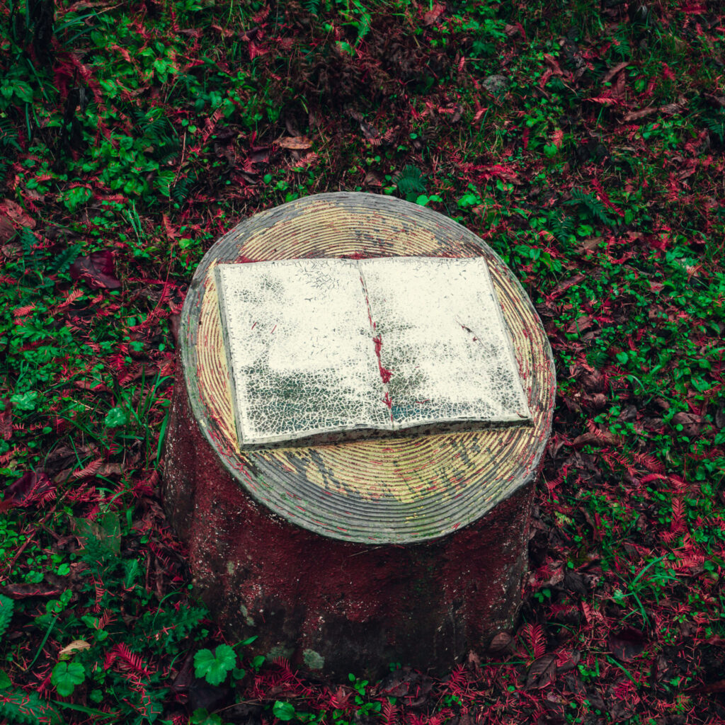 昔話の像の前には絵本が置かれている。物語が書かれているかと思いきや、消えてしまってほぼ真っ白。