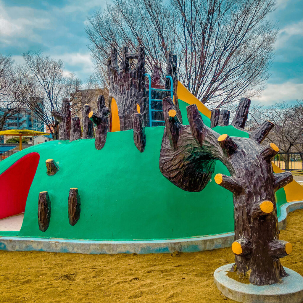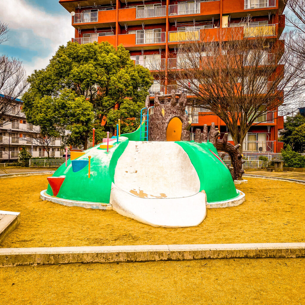 なんだろう。西洋の騎士の兜を被ってるような木の展望台風なものと、地面からすべり台にくっついてるこの木の生き生きとした力強さ。RPGのラスボスまではいかないけど、ゴーレムみたいに町を守ってる打たれ強さ的なのを勝手に感じれて非常に好きである。