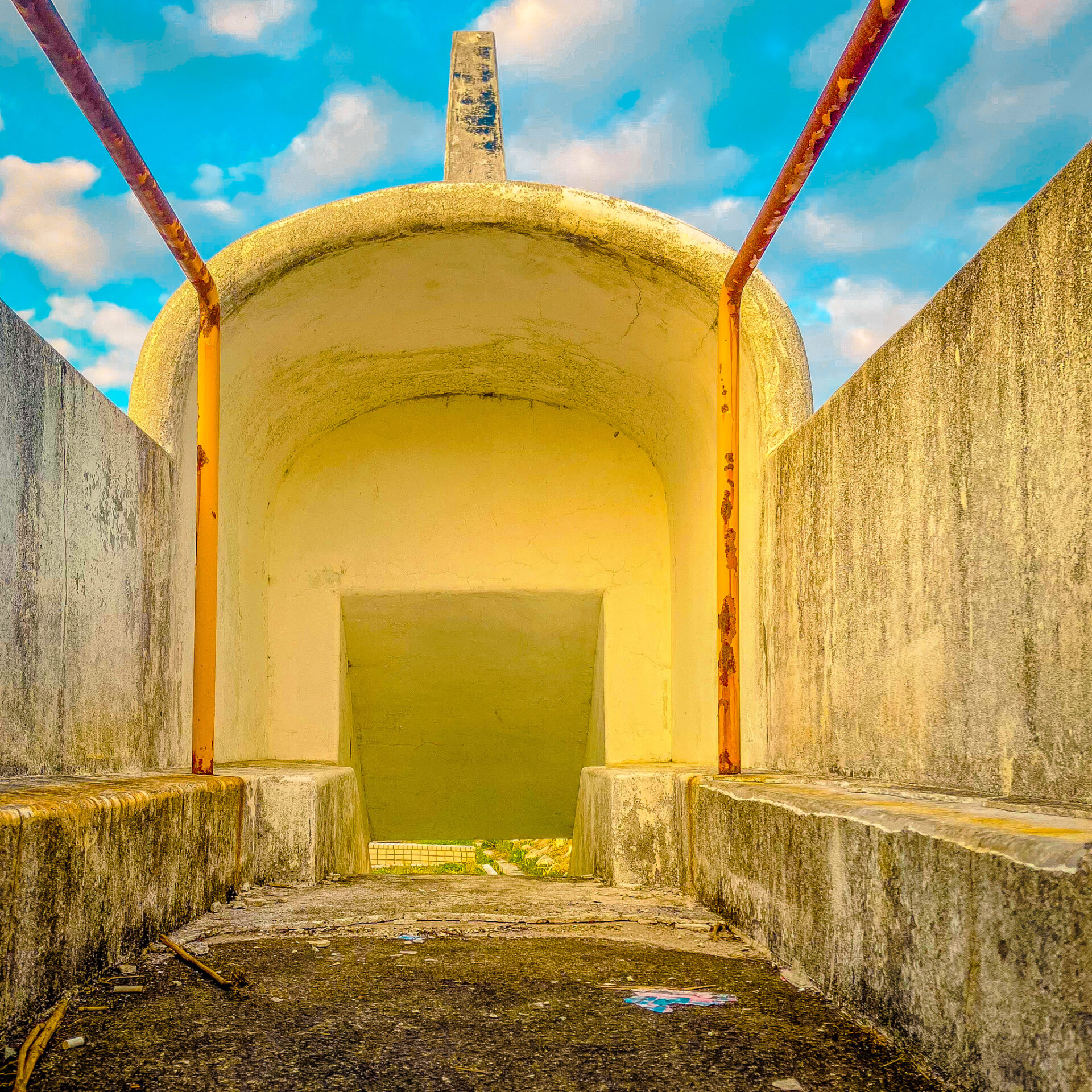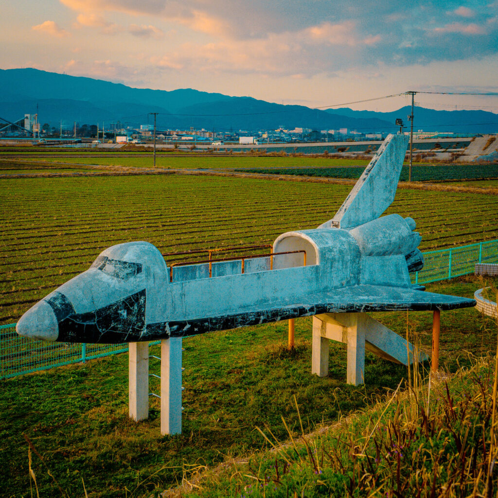 1981年にコロンビア号が初飛行を果たし、まさに宇宙開発ブーム。ということで次世代の公園遊具として設置されたのがこのようなスペースシャトル型の遊具だろう。宇宙人の遊具だったり、UFOの遊具だったり。発射台付きの遊具だったりと、この時代の公園遊具はコンクリート製のメチャクチャいいデザインばっかりである。